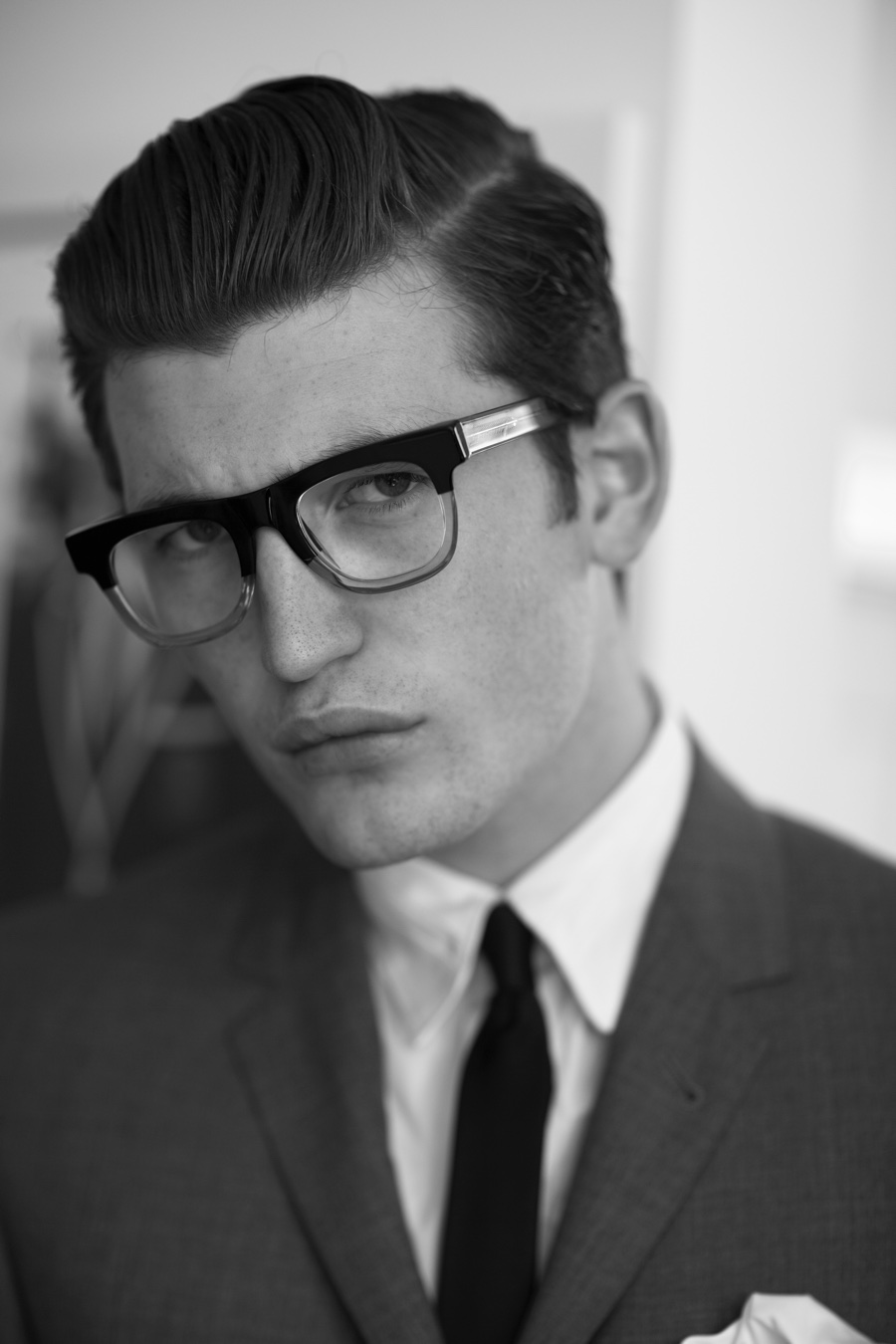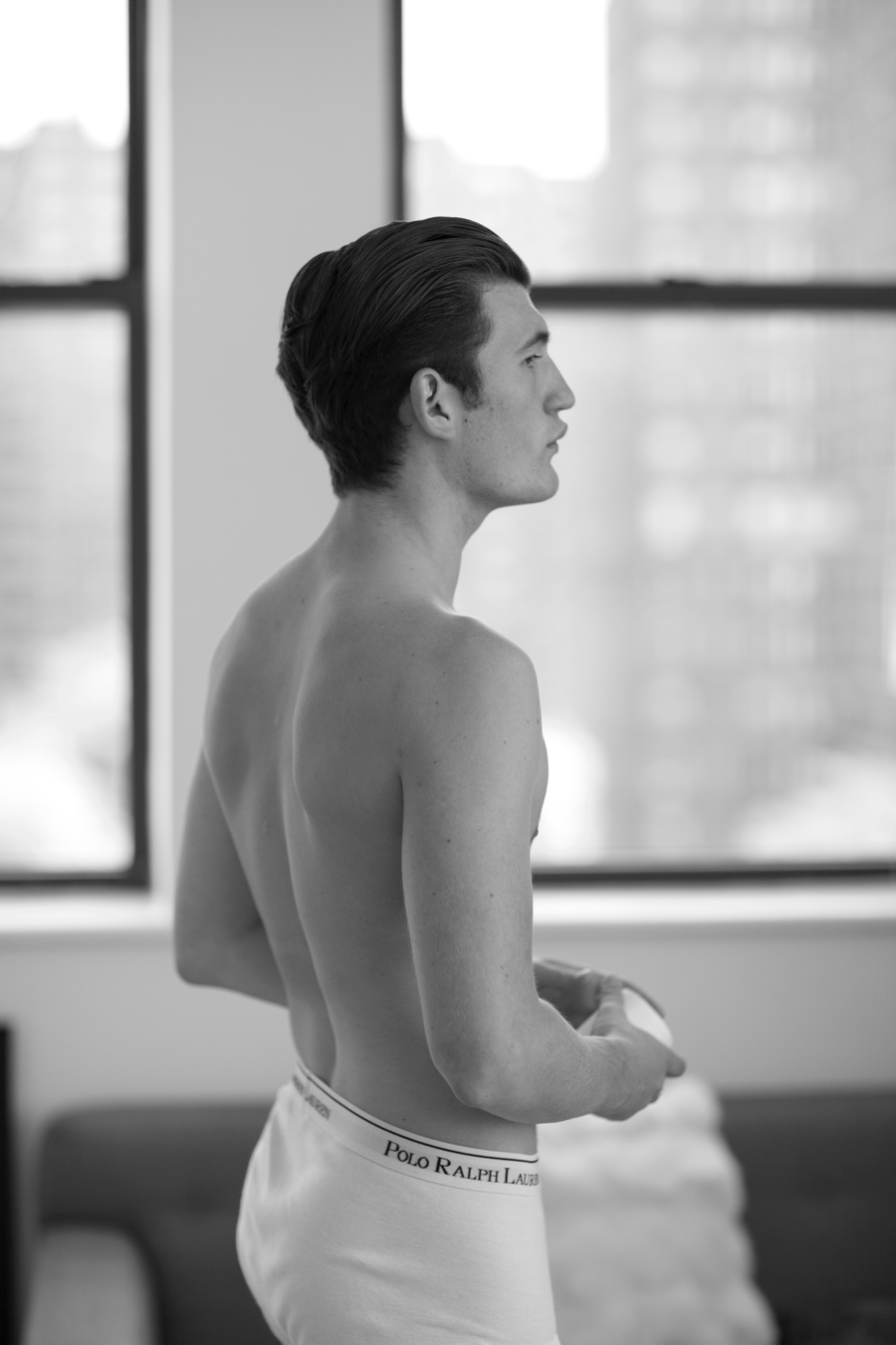 Q model Dylan Hartigan is back on our pages as he links up with fashion photographer Arnaldo Anaya-Lucca for an essential outing. Retreating indoors for a black & white photo series, Dylan steps into quite the debonair role as he goes from lounging around in his Polo Ralph Lauren underwear to donning a Thom Browne for Black Fleece suit.