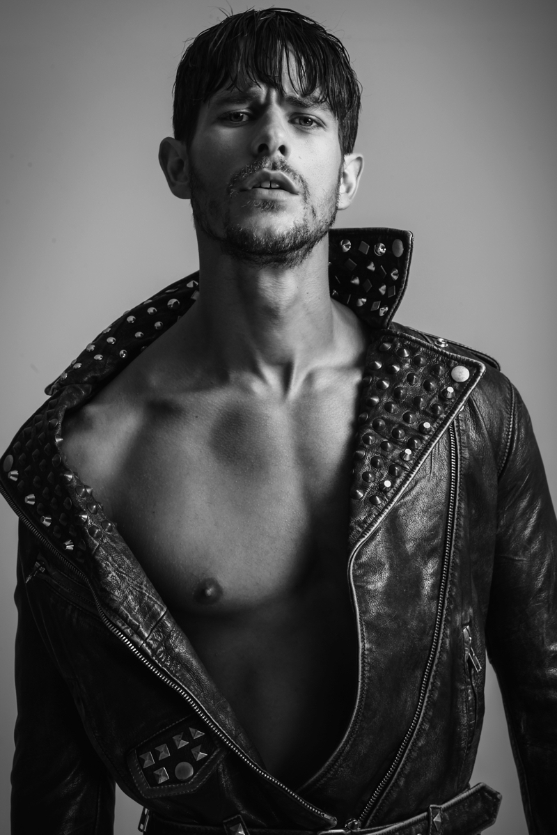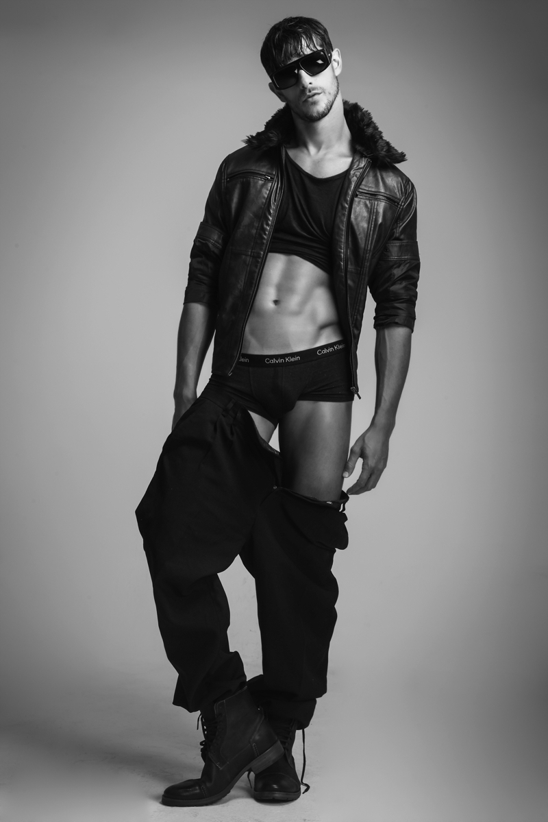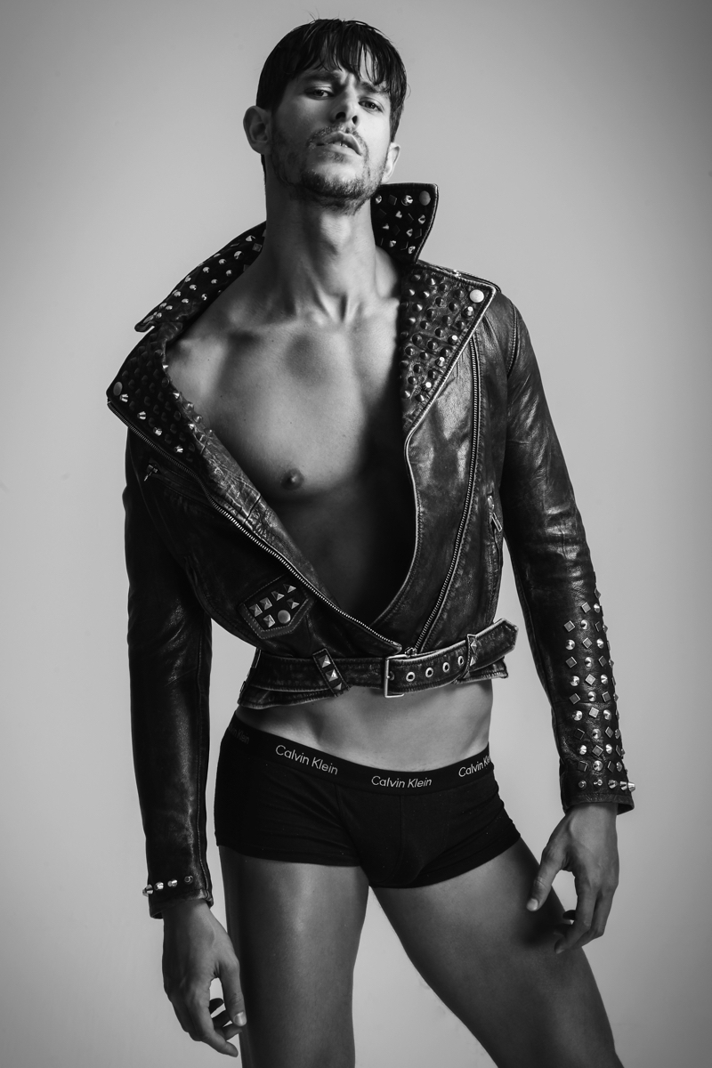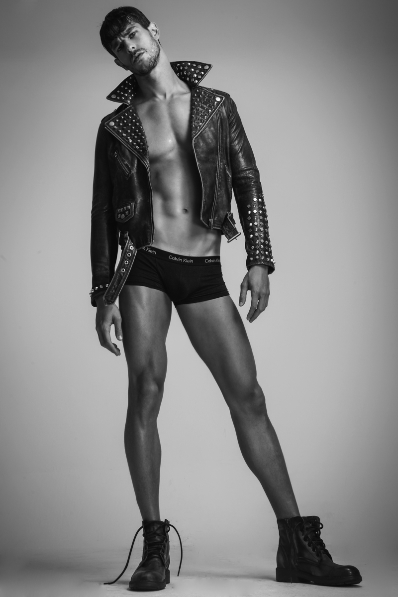 Felipe wears leather jacket Diesel, underwear Calvin Klein and boots Democrata.