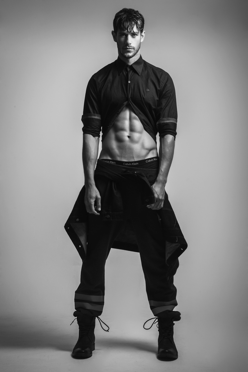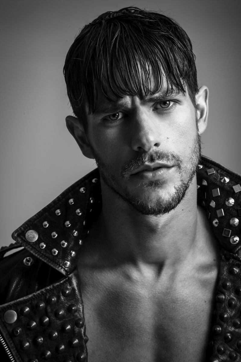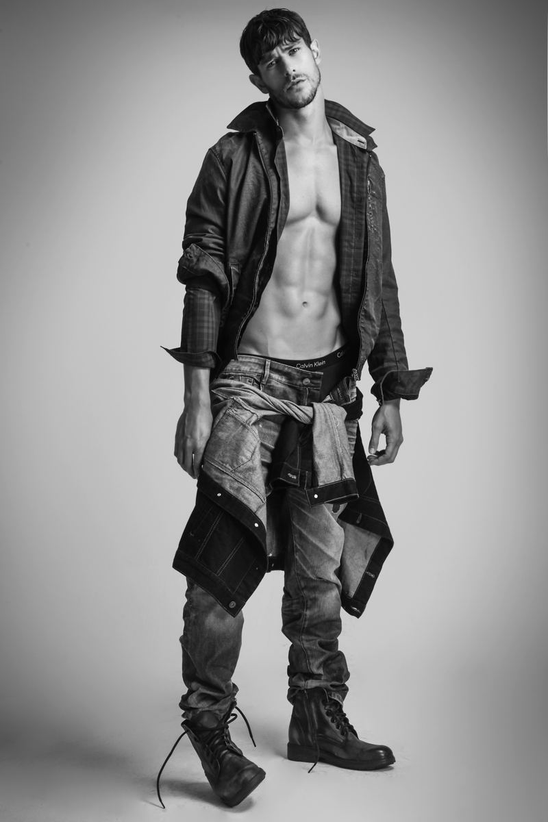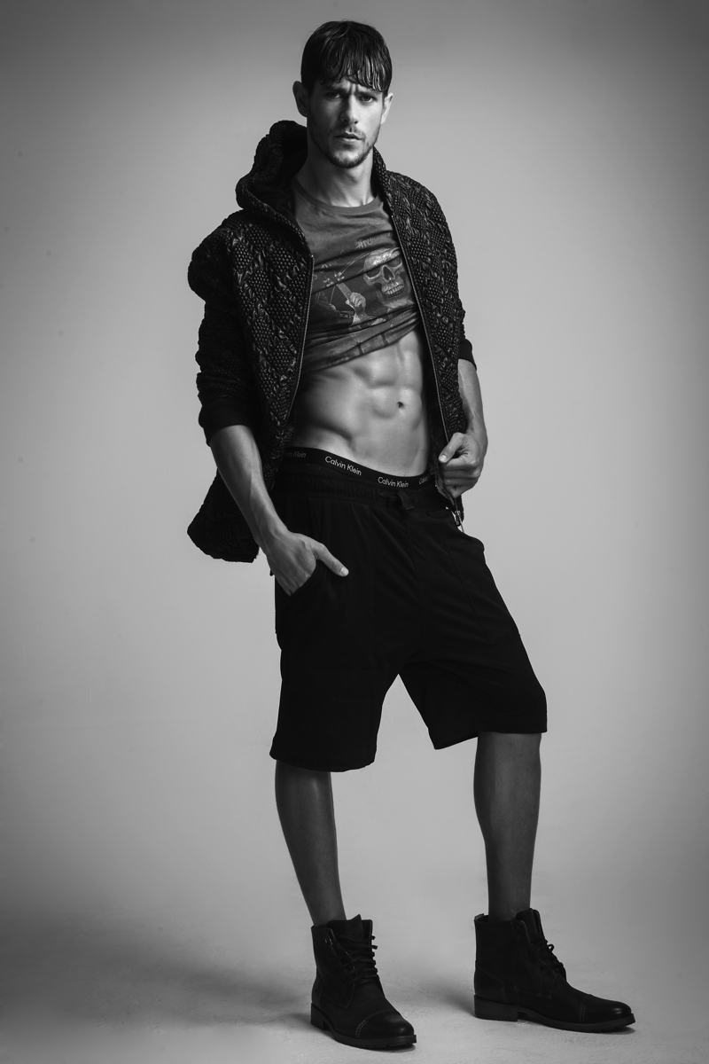 Felipe wears leather jacket Diesel, underwear Calvin Klein and boots Democrata.