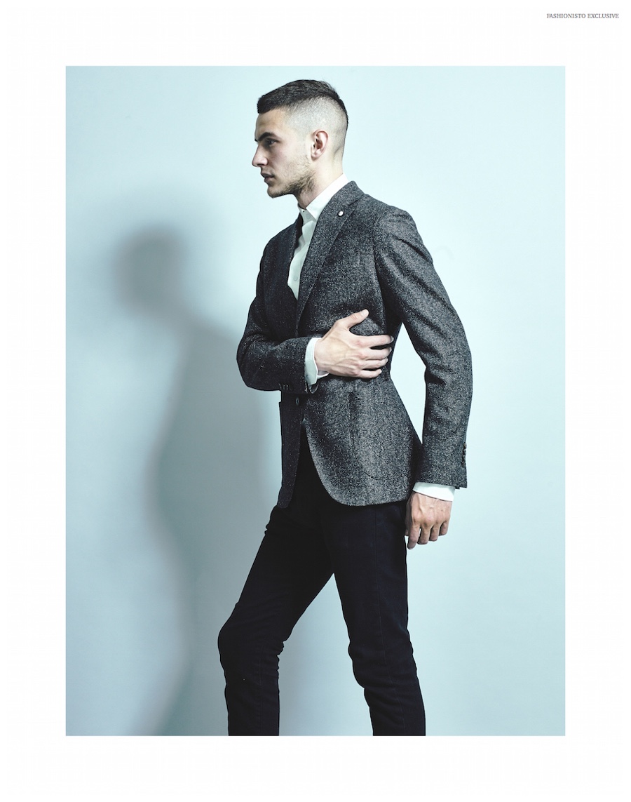 Model Jack Manhood (Red Model Management) returns to our pages with a new exclusive from photographer Richard Gerst. Following up his shoot with another promising Red face, Miles Hurley, Gerst captures Jack in chic studio images. Mixing a tailored finesse with modern proportions from the likes of Public School, Jack is styled by David Chavez. / Photo and style assistance by Rocco Morabito.
