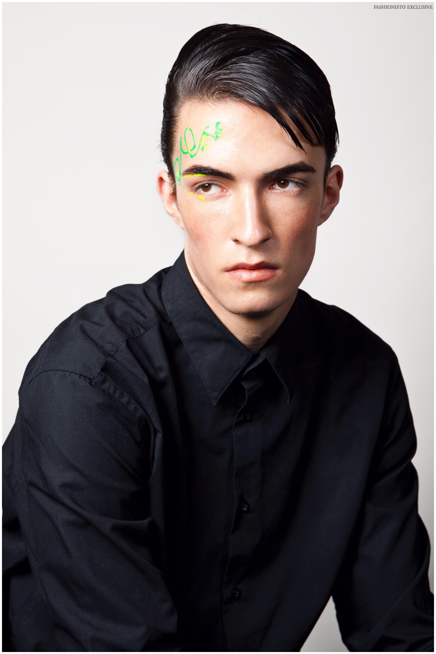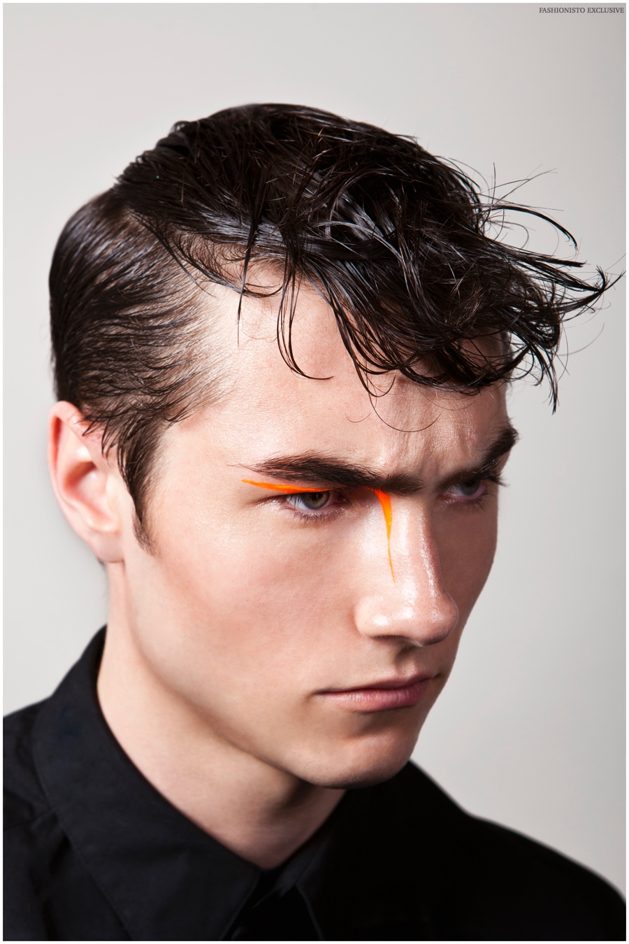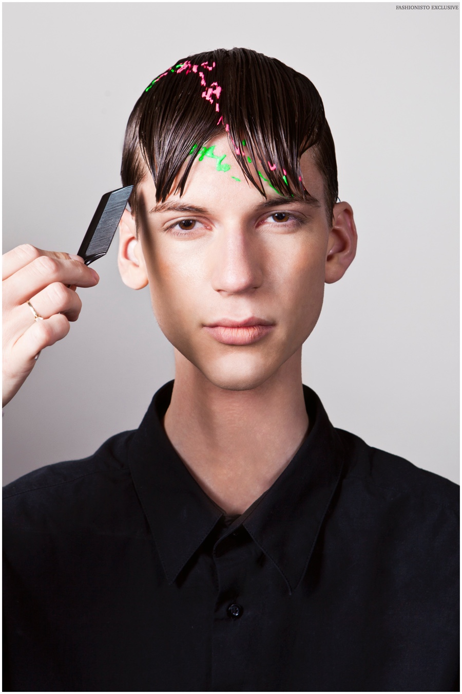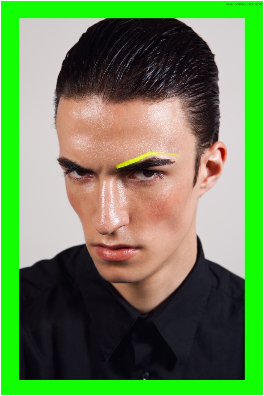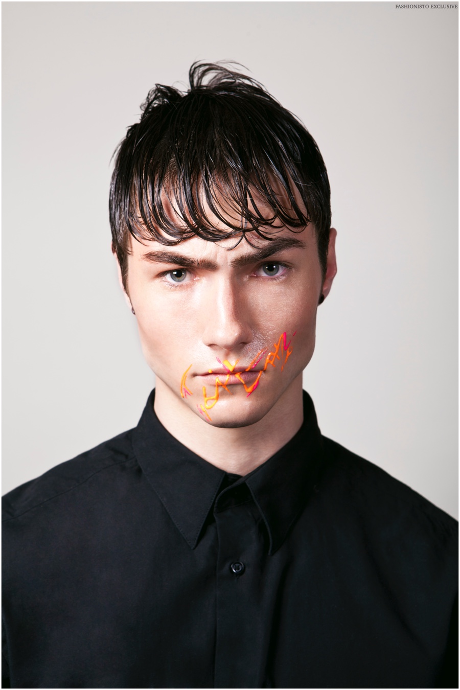 Photographer Wayta Patmo and grooming artist Niki Vos collaborate on a new exclusive that redefines the beauty narrative. Taking their cues from social media, Patmo and Vos pay a cheeky homage to the much more interesting lives people lead as conveyed over social media. Brooks models Arthur, Siebe and Sandor star in the story, sporting sleek wet hairstyles and expressing themselves with painted gibberish that hopefully keeps attention for more than a two-second scroll.