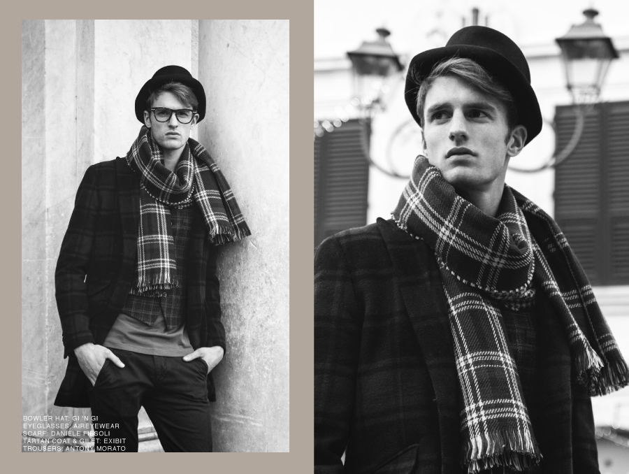 Quint wears bowler hat Gi ‘n Gi, eyeglasses Air Eyewear, scarf Daniele Fiesoli, trousers Antony Morato, tartan coat and vest Exibit.