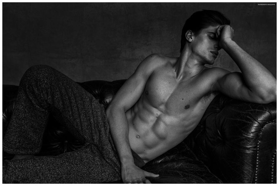 Just in case you can’t get enough of Santiago Ferrari (New York Models Management), we have a new striking feature with the model as he connects with fashion photographer Jeff Rojas. Taking up a casual style agenda, Santiago appears in moody black & white images. Sporting laid-back t-shirt and jeans fashions, Santiago is styled by Kimmie Smith (Accessory2). / Makeup by Sang Le (Factor Artists).