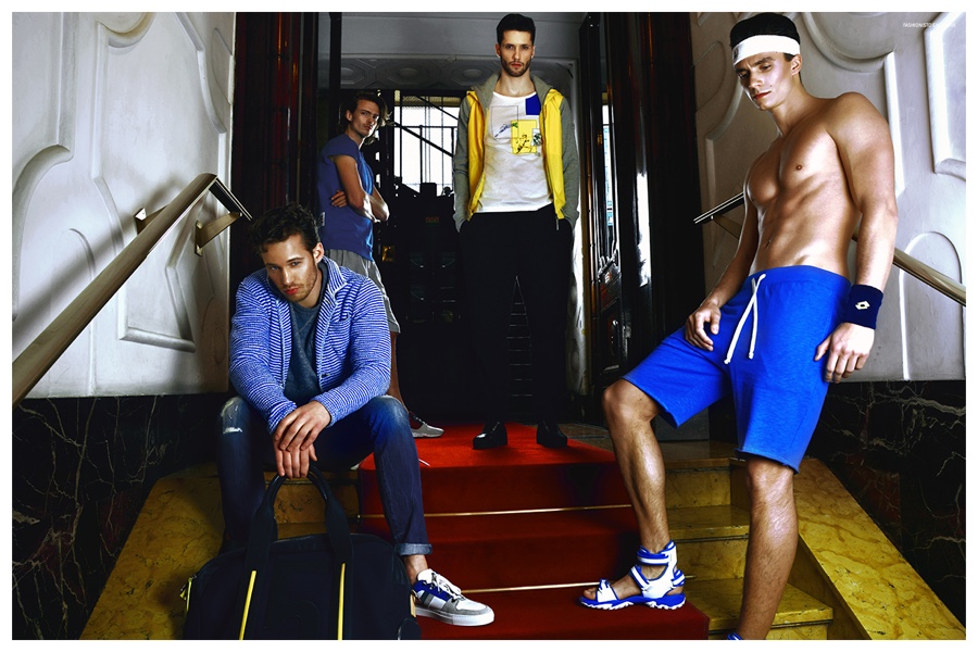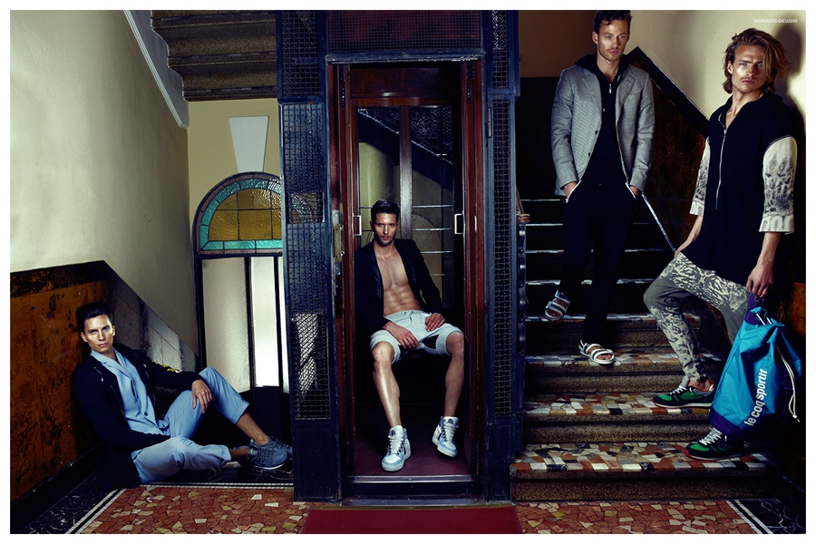 PinLeft to Right: Maximilian wears jacket Hamaki-Ho, sweatshirt Champion x Todd Snyder, bag Dirk Bikkembergs, denim jeans and sneakers Urban Les Hommes. Stefan wears sleeveless sweatshirt Department 5, sweatpants Dirk Bikkembergs and sneakers LeCoq Sportif. Elia wears sweatshirt Bench, tank Dirk Bikkembergs, trousers Mauro Grifoni and shoes Rocco P. Nikola wears sweatpants Erreà Republic, headband Le Coq Sportif, armband Lotto and shoes Dirk Bikkembergs.