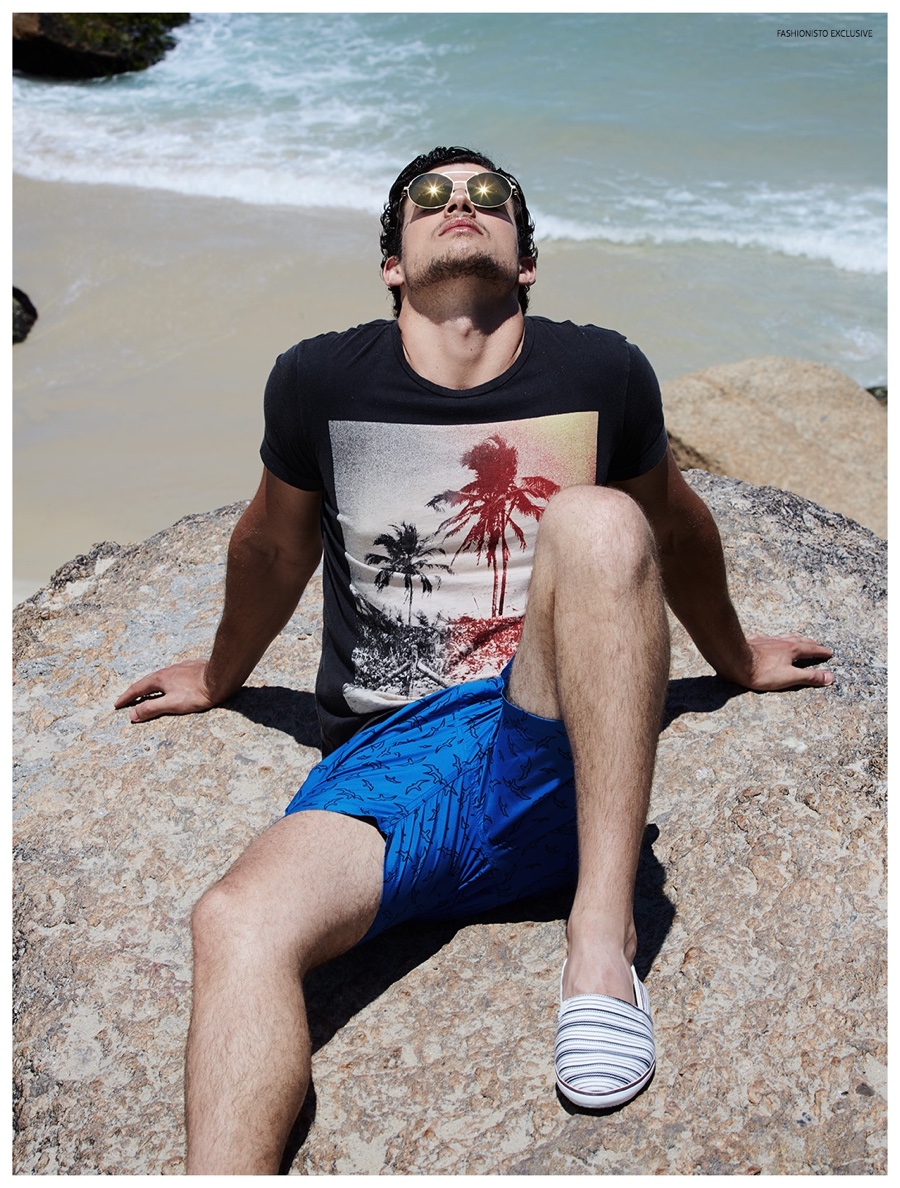 Ford Brazil model Thiago Jannuzzi hits the beach for a timely look at summer fashions. Photographed by Richard Machado, Thiago is pictured in trendy retro-inspired styles. Bringing together lively colors and smart prints, stylist Eric Launder (Halley Resources) spotlights fashions from Vilebrequin, Billy Reid and other labels. / Photo assistance by Arnaldo Borensztajn and Rivo André Simoes. Production by 21 Sun Productions.