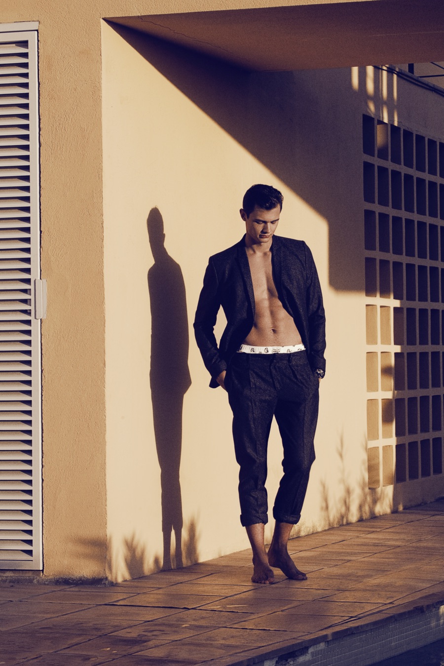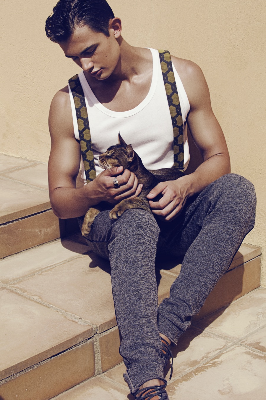 PinSimon wears braces Soloio, undershirt Hence, pants Custo Barcelona and sneakers Munich.