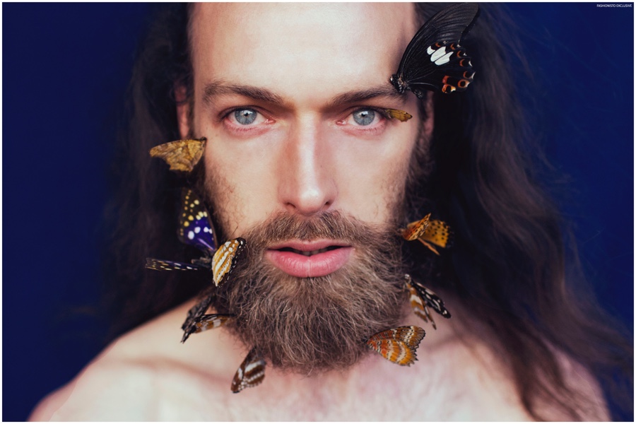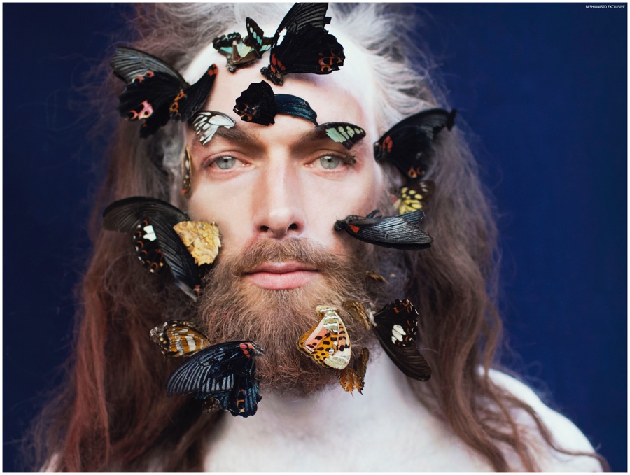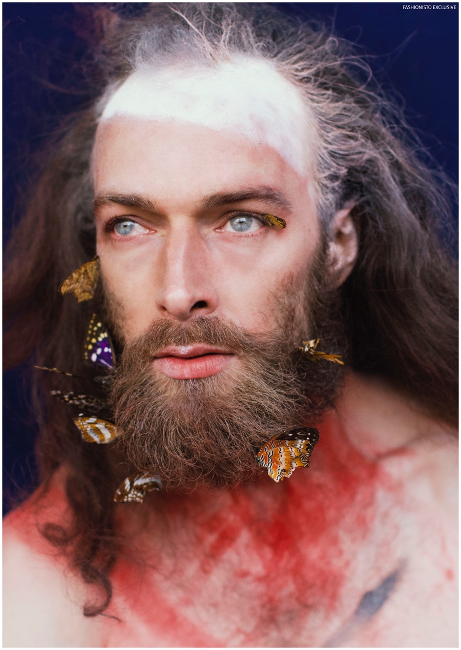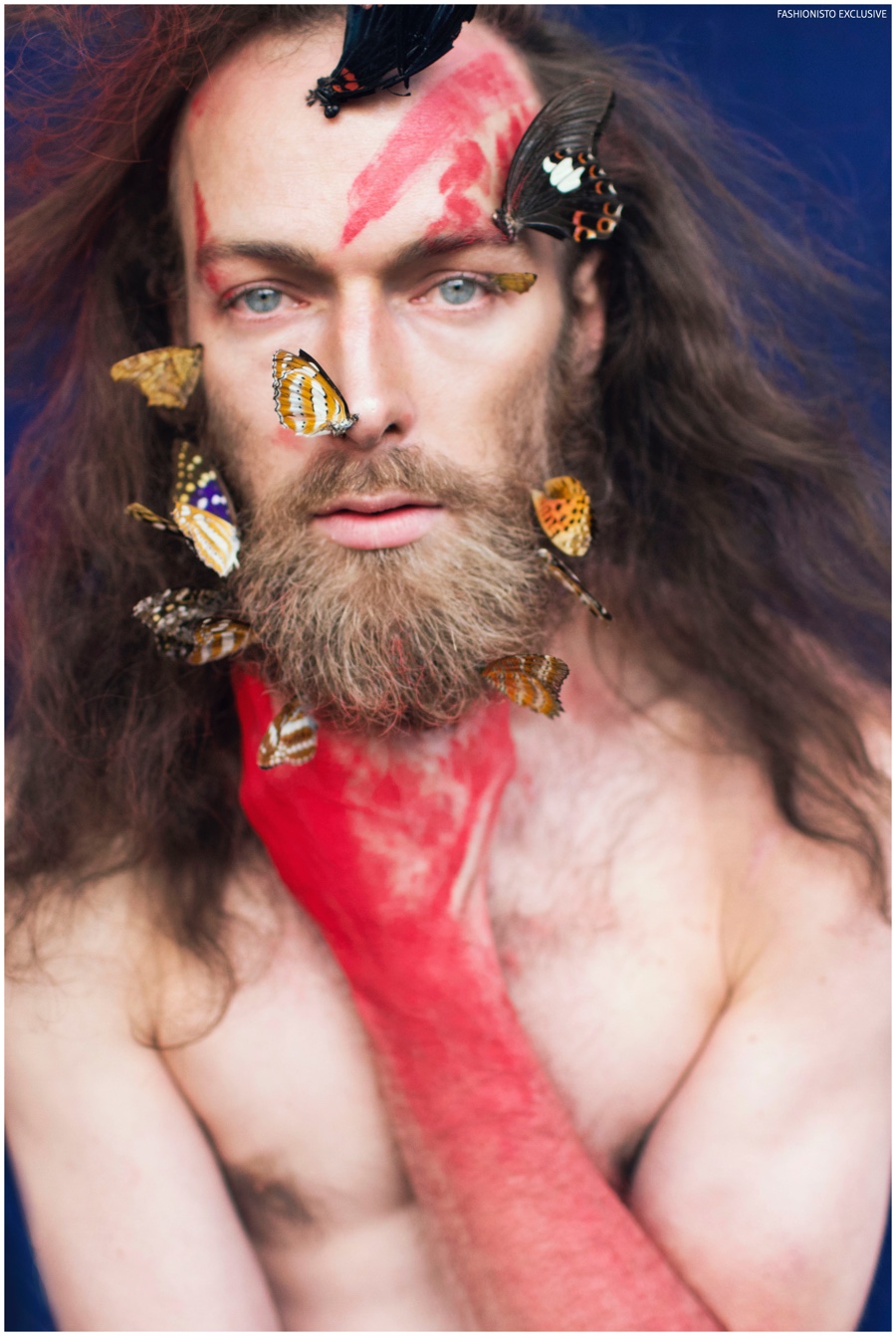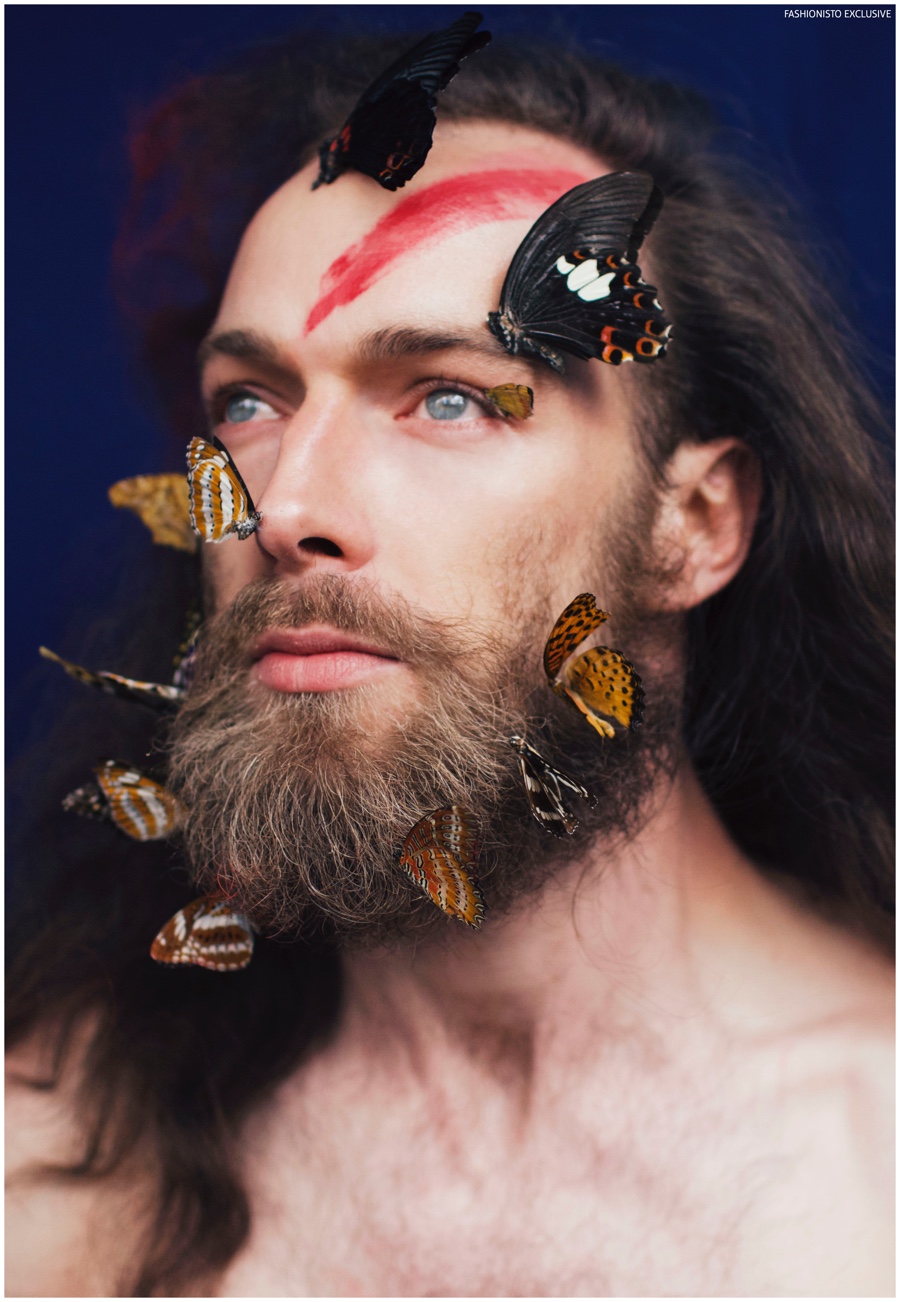 One of our all-time favorite models, Will Lewis returns to our pages with a stunning new exclusive lensed by photographer Rachel Thalia. Entering the photo studio for a beauty series, Will inspires in red, white and blue as his long hair is styled in a relaxed manner by hair artist Anike Rabiu (AKR Styles). Decorated in butterflies and various pigments, Will is groomed by makeup artist Ann Benjamas (Twenty-Two Makeup Studio).