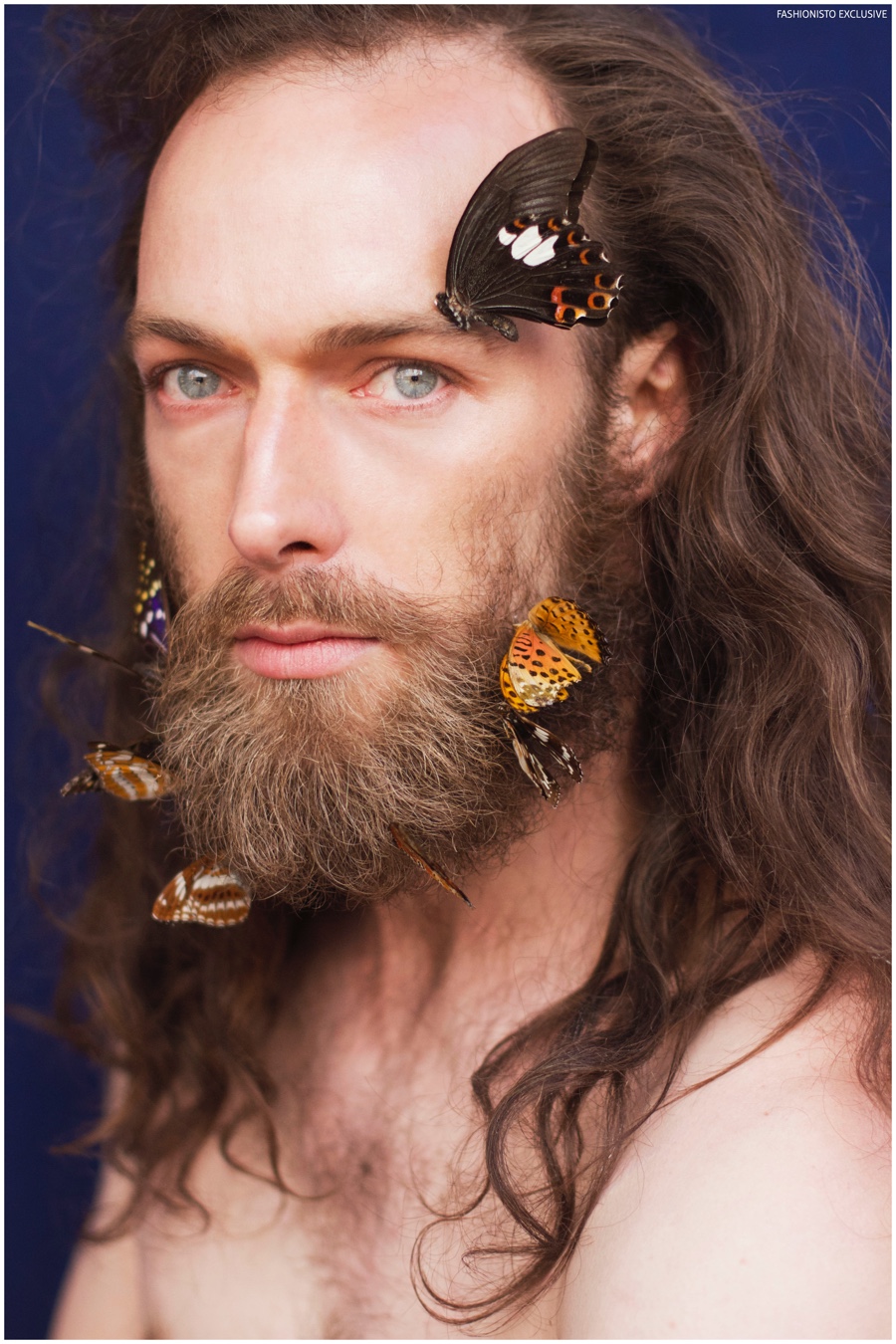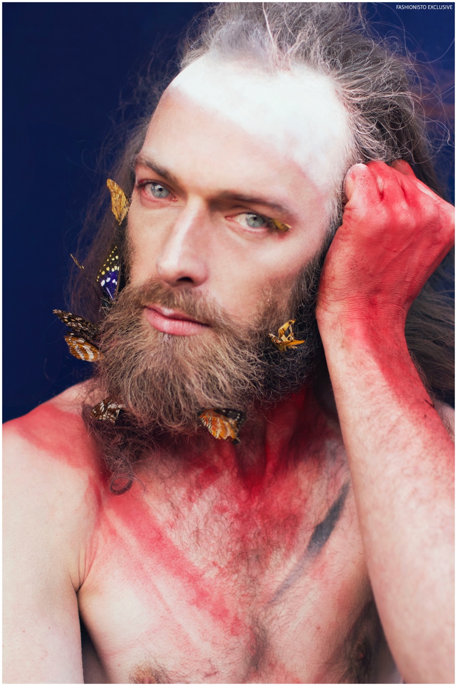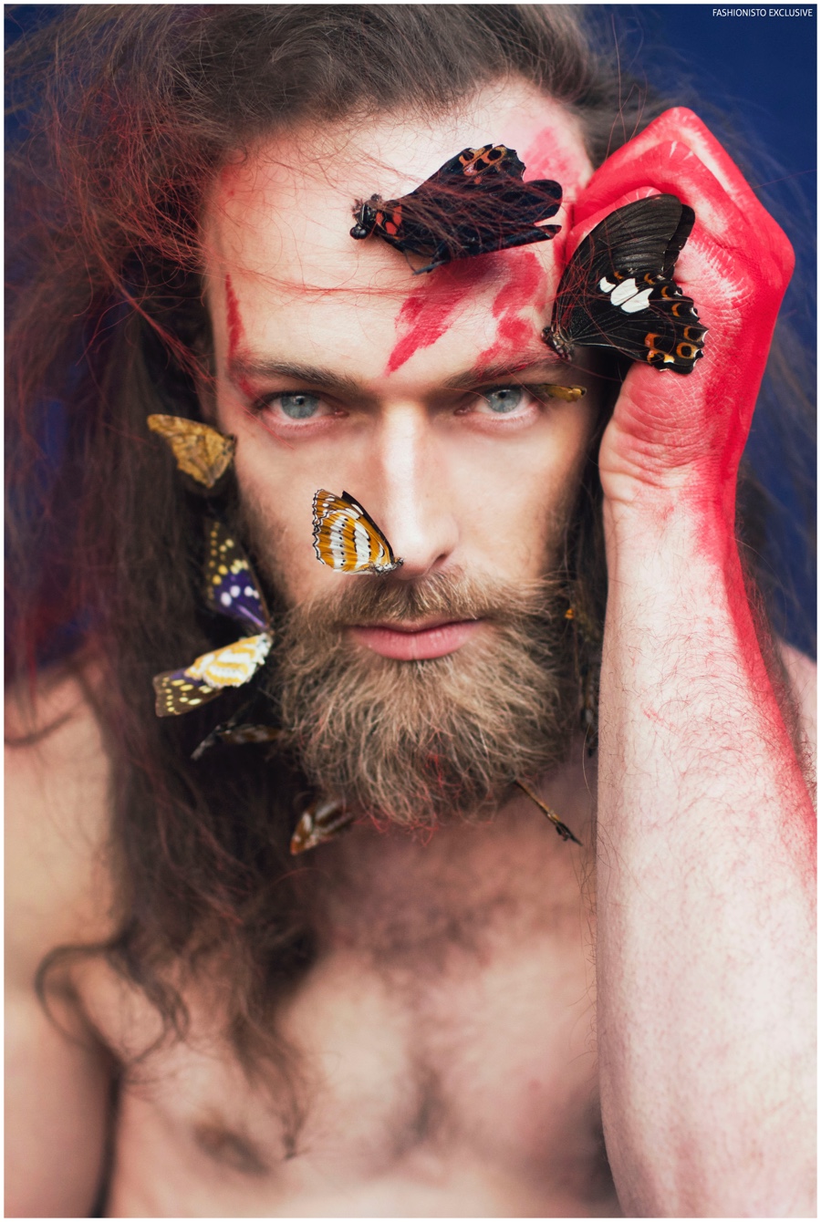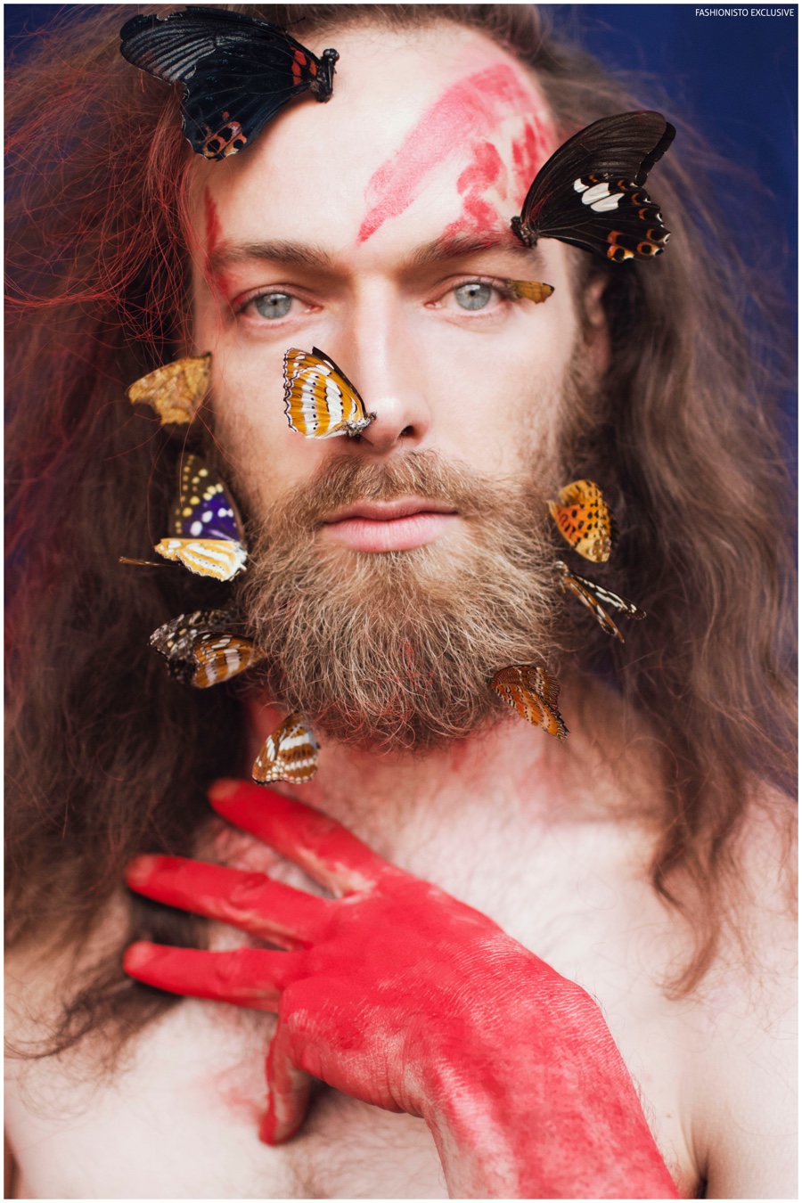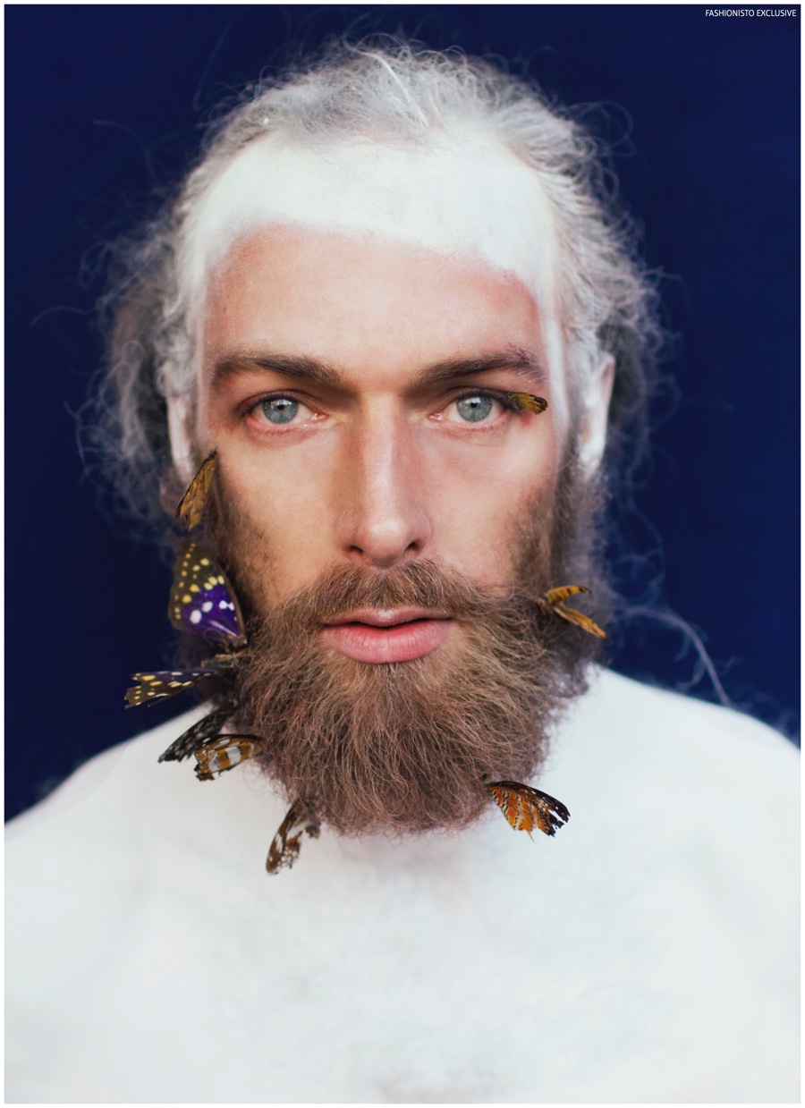 One of our all-time favorite models, Will Lewis returns to our pages with a stunning new exclusive lensed by photographer Rachel Thalia. Entering the photo studio for a beauty series, Will inspires in red, white and blue as his long hair is styled in a relaxed manner by hair artist Anike Rabiu (AKR Styles). Decorated in butterflies and various pigments, Will is groomed by makeup artist Ann Benjamas (Twenty-Two Makeup Studio).