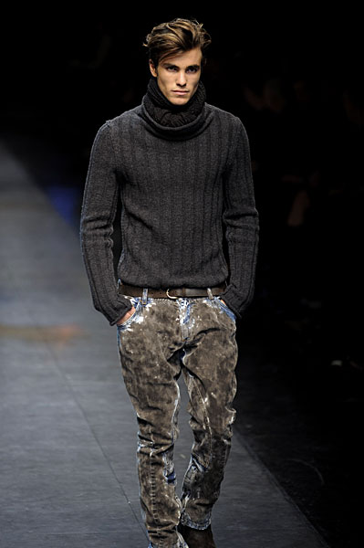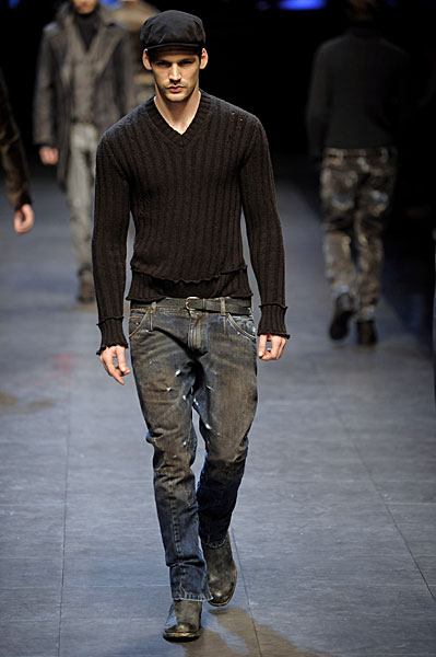 Dolce & Gabbana tones down the luxe factor this season with a varied collection of the usual pieces, but a gritty element. Void of color and not afraid of a rip, hole or two, the range’s most notable pieces are found in the disheveled tanks, knits and longjohns. Alternatively, Dolce & Gabbana’s man, who is known to work with his hands is championed by the oil-like wash given to the collection’s denim. Finally, speckled knits, tweed and velvet find their way into this season’s offerings for those special occasions.