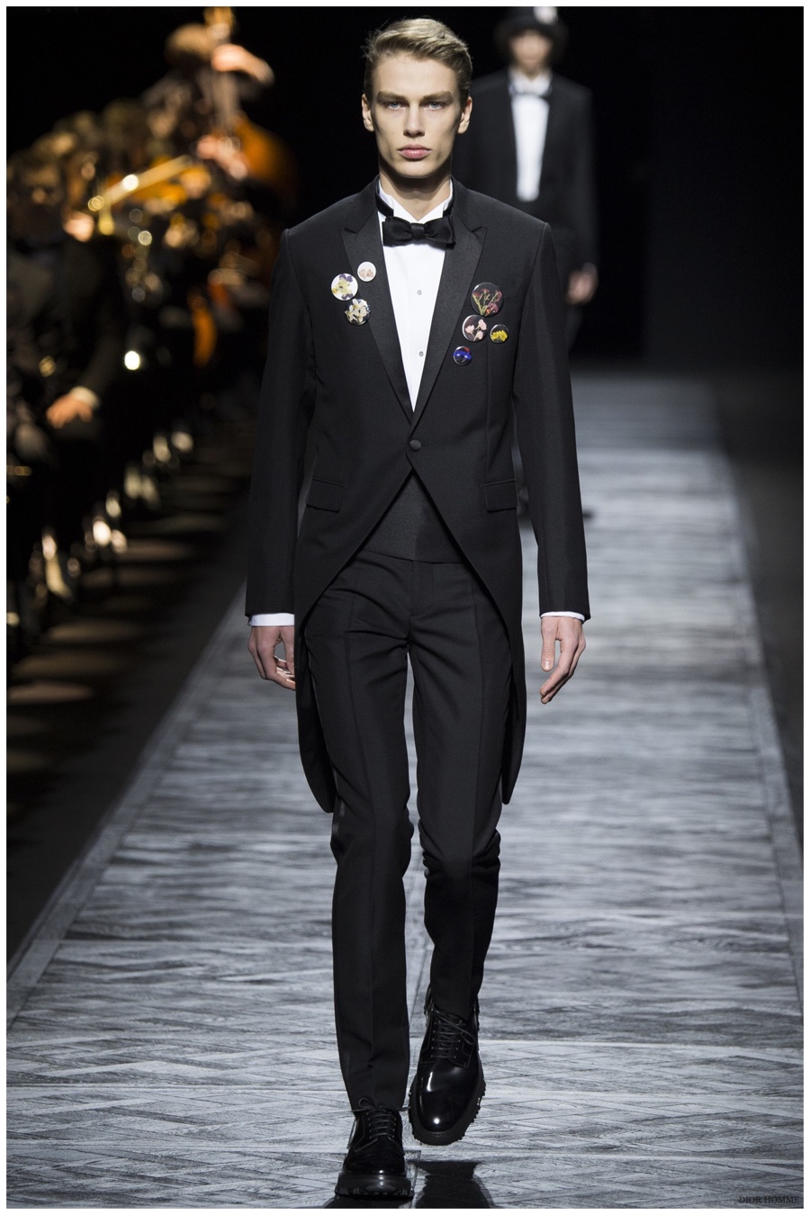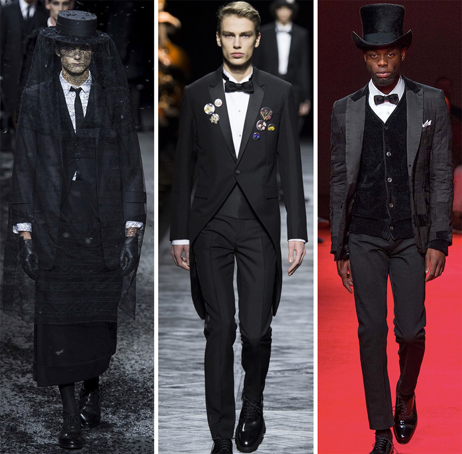 PinLeft to Right: Thom Browne, Dior Homme, Junya WatanabePinDior Homme Fall-Winter 2015 Menswear Collection. One idea that Dior Homme creative director Kris Van Assche prides himself on is making menswear accessible. Taking traditional pieces in a sportier direction, Van Assche set his sights on the tuxedo for part of his latest collection. The results were effortless proportions that deviated from the standard, adding length and style.PinThom Browne Fall-Winter 2015 Menswear Collection. American designer Thom Browne staged an impressive funeral for his fall outing in Paris. The star of the event was the mourning suit, revisited in chic layers with impeccable fits. If a long skirt isn’t your cup of tea, Browne had plenty of his trademark skinny trousers.PinJunya Watanabe Fall-Winter 2015 Menswear Collection. Known for its clothes that have a charming, rustic quality, Junya Watanabe deviated from the usual path for fall, presenting formalwear reworked for everyday style. Striking to say the least, smart tailoring and fabric choices solidified a strong fall collection.PinPrada Fall-Winter 2015 Menswear Collection. Designer Miuccia Prada had thoughts of simplicity on the mind for fall. A clean, minimal black color palette dressed sharp tailoring, lending itself nicely to the modern, lean suit and accompanying companion pieces such as the short double-breasted coat.