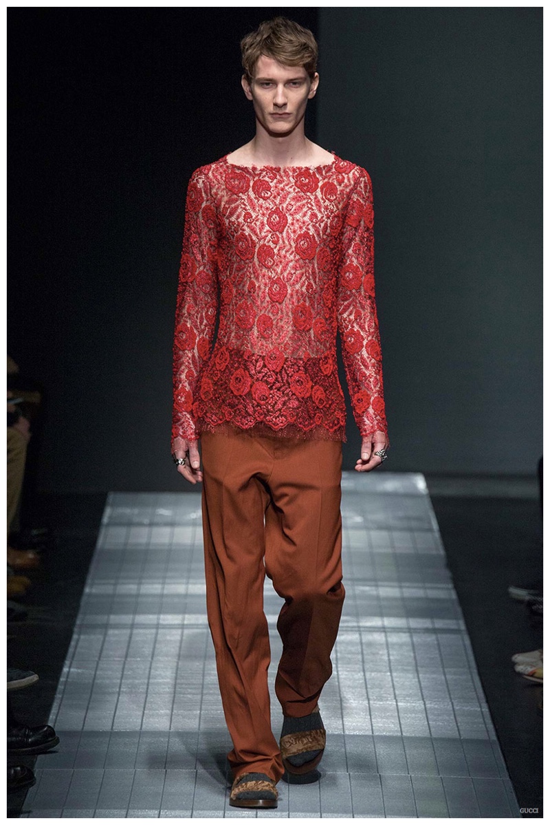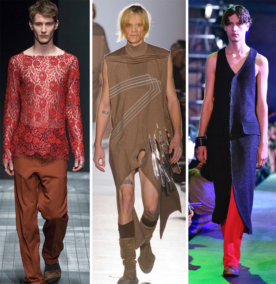 PinLeft to Right: Gucci, Rick Owens, Raf SimonsPinGucci Fall-Winter 2015 Menswear Collection. New Gucci creative director Alessandro Michele proposed a fragile approach to menswear for his debut collection for fall/winter 2015. Red lace delivered a colorful punch that deviated from traditional menswear.PinRick Owens Fall-Winter 2015 Collection. Designer Rick Owens made headlines with his fall collection. Sending his models down the catwalk in revealing clothes that featured the penis on display, Owens championed equal objectification. Long tunics in earthy hues contributed to a unisex look.PinRaf Simons Fall-Winter 2015 Menswear Collection. The lean lines of Simons’ menswear lends itself well to cross over to unisex wear. For fall, Simons delivered minimal fashions that channeled his younger days as a rebellious designer during the 90s.PinJ.W. Anderson Fall-Winter 2015 Menswear Collection. Designer Jonathan Anderson makes it no secret that he is inspired by womenswear when it comes to designing for his men. Anderson’s soft silhouettes called on the 1970s for inspiration.