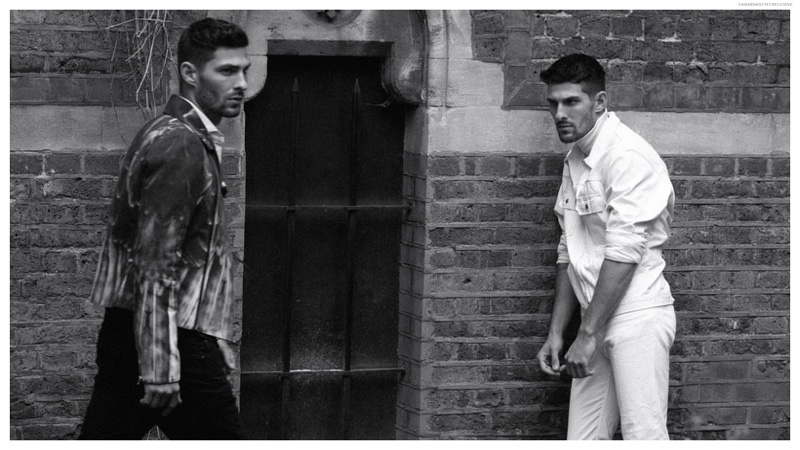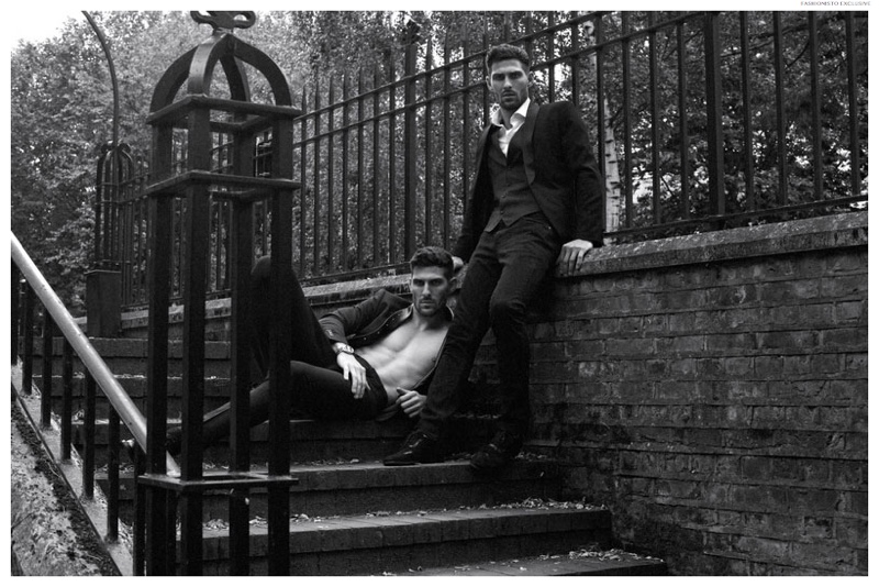 Kane & Abel-AMCK model twin brothers Adam and Chris Mort make their Fashionisto debut with a story lensed by Lewis & Marshall. Venturing outdoors for a dark narrative envisioned with black & white photography, the Mort twins are styled by Steven Doan. Sporting an eclectic wardrobe, Adam and Chris model styles from the likes of Dolce & Gabbana and Just Cavalli.