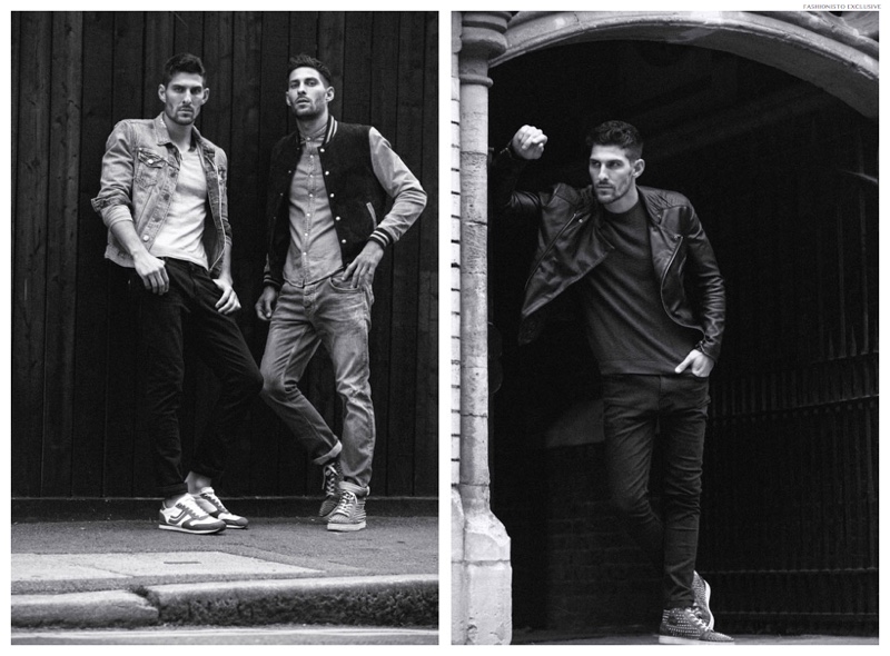 PinLeft: Chris wears suit H&M, shoes Peter Werth, vintage scarf and hat stylist’s own. Right: Chris wears jeans 7 For All Mankind.PinAdam wears jacket Scottacus Anthony, top Dolce & Gabbana and jeans Calvin Klein. Chris wears vintage jacket stylist’s own, turtleneck Reiss London and jeans 7 For All Mankind.PinChris wears bomber jacket Topman, jeans AllSaints and belt Oliver Sweeney. Adam wears all clothes AllSaints.PinLeft: Chris wears suit H&M, shoes Peter Werth, vintage scarf and hat stylist’s own. Right: Chris wears leather jacket Burberry, top Zara, jeans Dsquared2 and boots Diesel.PinLeft: Adam wears all clothes AllSaints. Chris wears bomber jacket Topman, jeans AllSaints and belt Oliver Sweeney. Right: Chris wears leather jacket Burberry, top Zara, jeans Dsquared2 and boots Diesel.PinChris wears suit H&M, shoes Peter Werth, vintage scarf and hat stylist’s own.