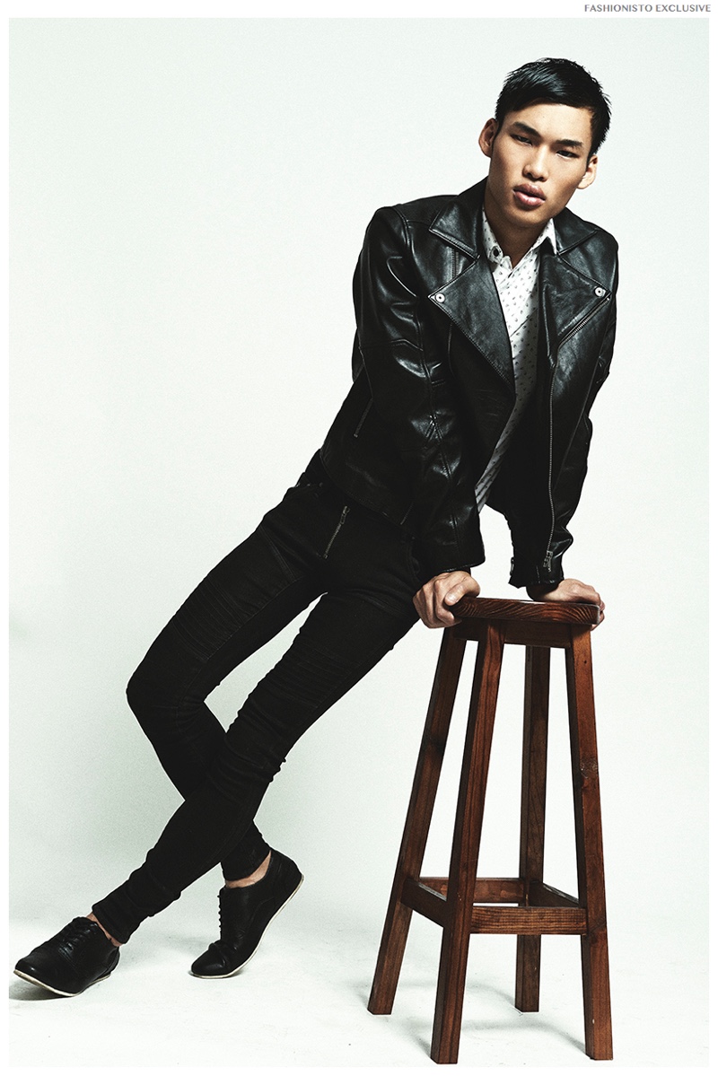 Chun wears shirt and shoes Zara, jeans and leather jacket G-Star Raw.Pin