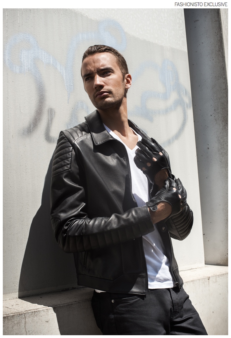 Clement wears trousers Zara, t-shirt stylist's own, jacket and gloves Christopher Bates.Pin