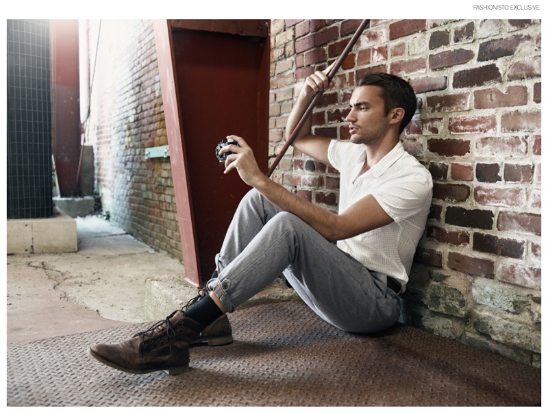 Clement wears white shirt XOOS, pants Scotch & Soda, belt stylist's own and boots Zara.Pin