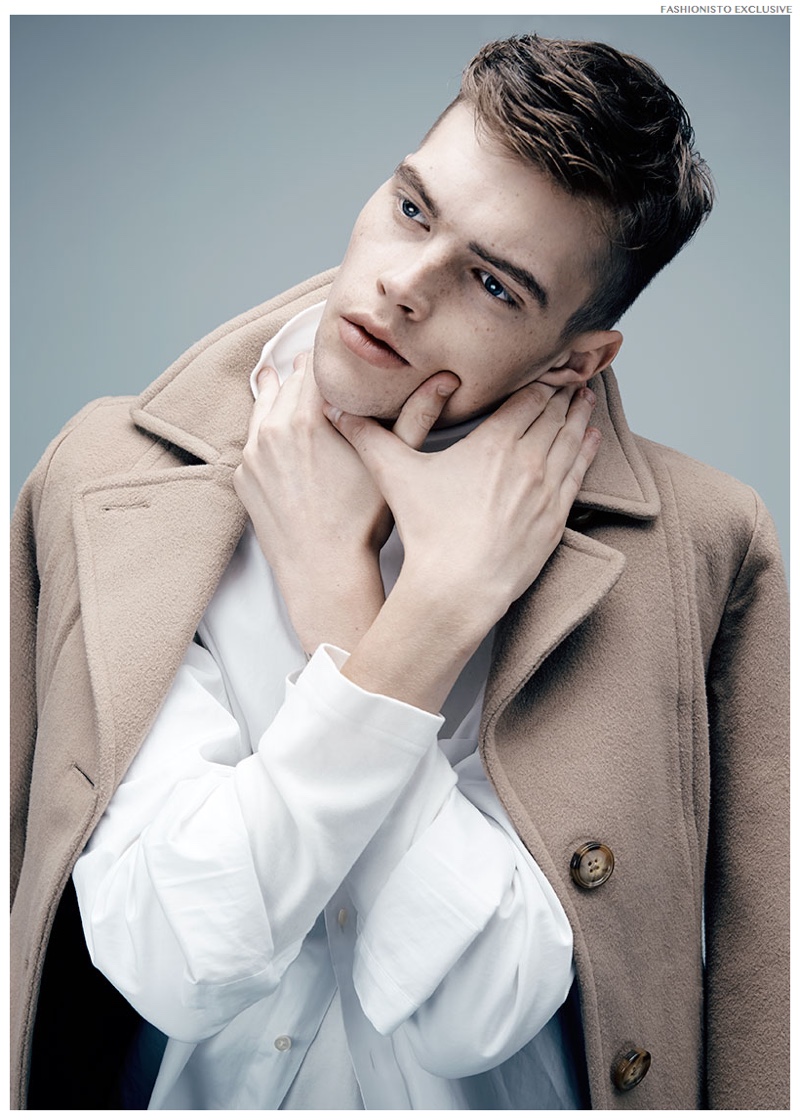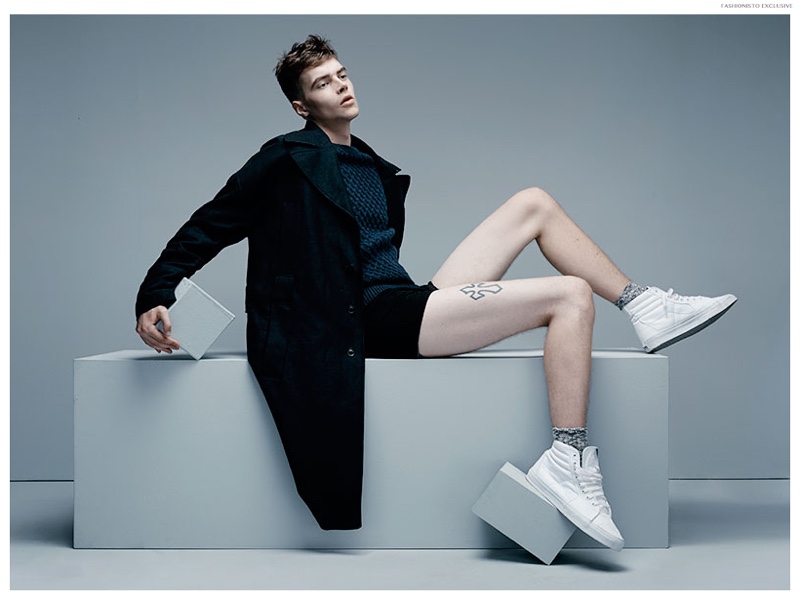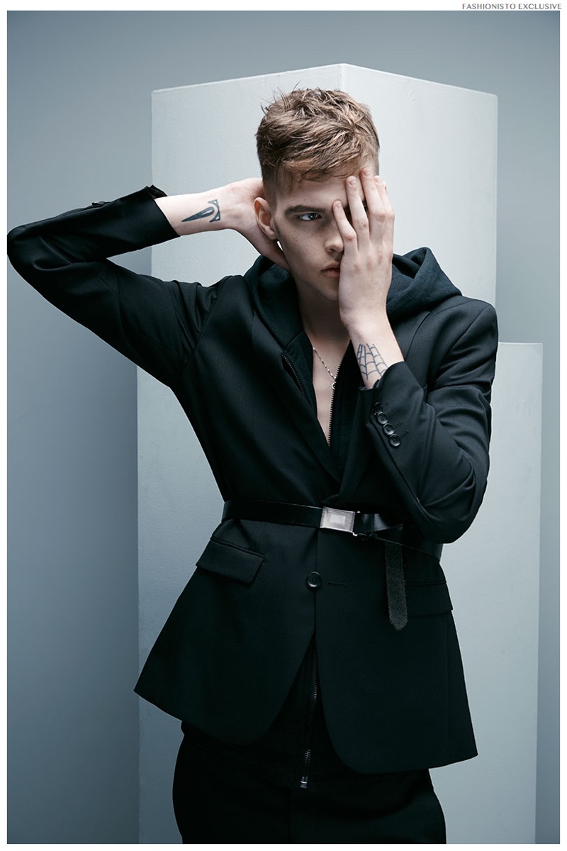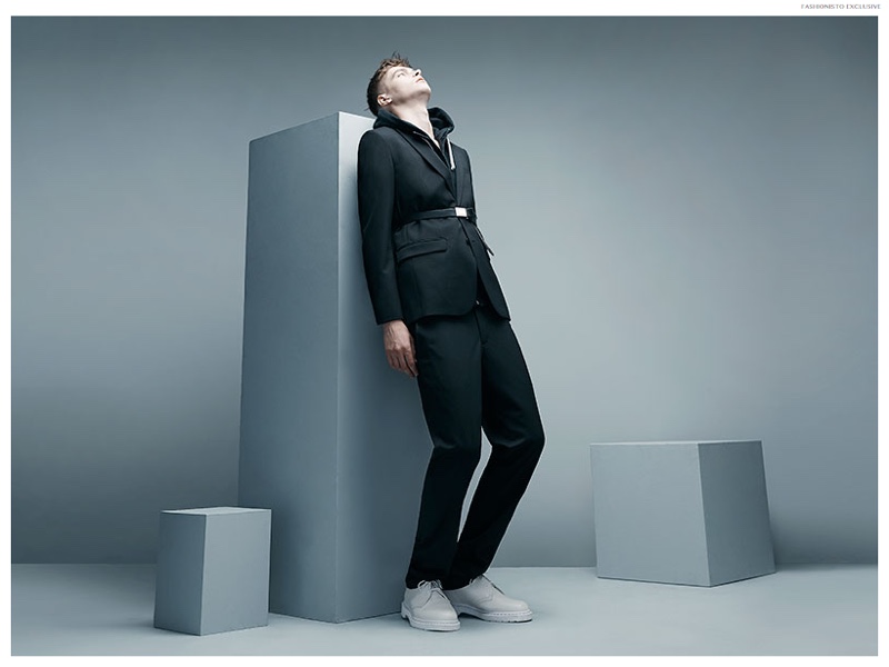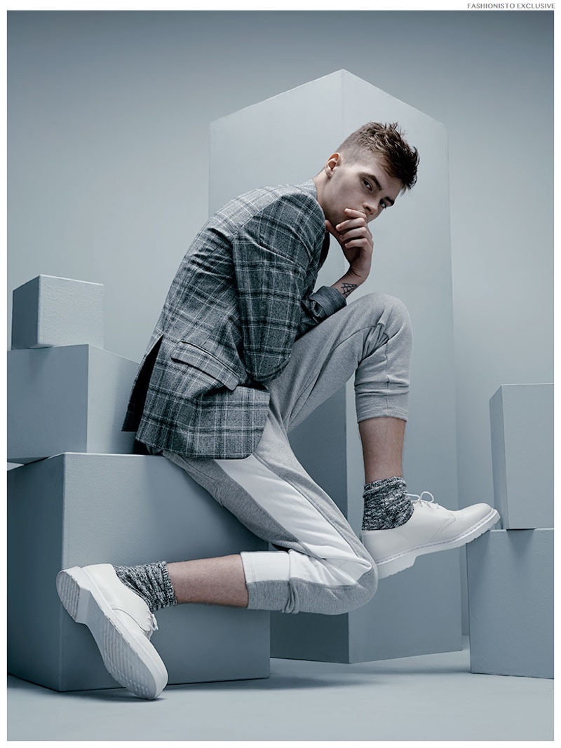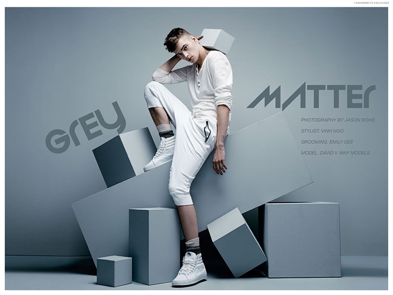 Grey Matter-New York Model Management fresh face David Vaicekavicius makes his Fashionisto debut with an exclusive lensed by fashion photographer Jason Rowe. Wearing a mix of soft and dark hues for fall, David is styled by Vinh Ngo as he hits the photo studio. Posing against geometric blocks, David makes a contemporary style statement in garments from John Varvatos, Z Zegna, Versace and more.