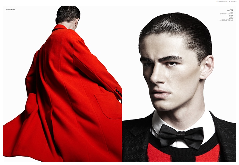 Get Into the Groove-Black and red are on the mind as photographer Iko Maramo and stylist Vanessa Sanchez join creative forces for a chic new exclusive for the season. Elite Toronto model Derek is front and center in devastating must-haves, wearing great pieces from Versace, Dolce & Gabbana and Prada, among other luxury labels. / Grooming by Windy Chiu.