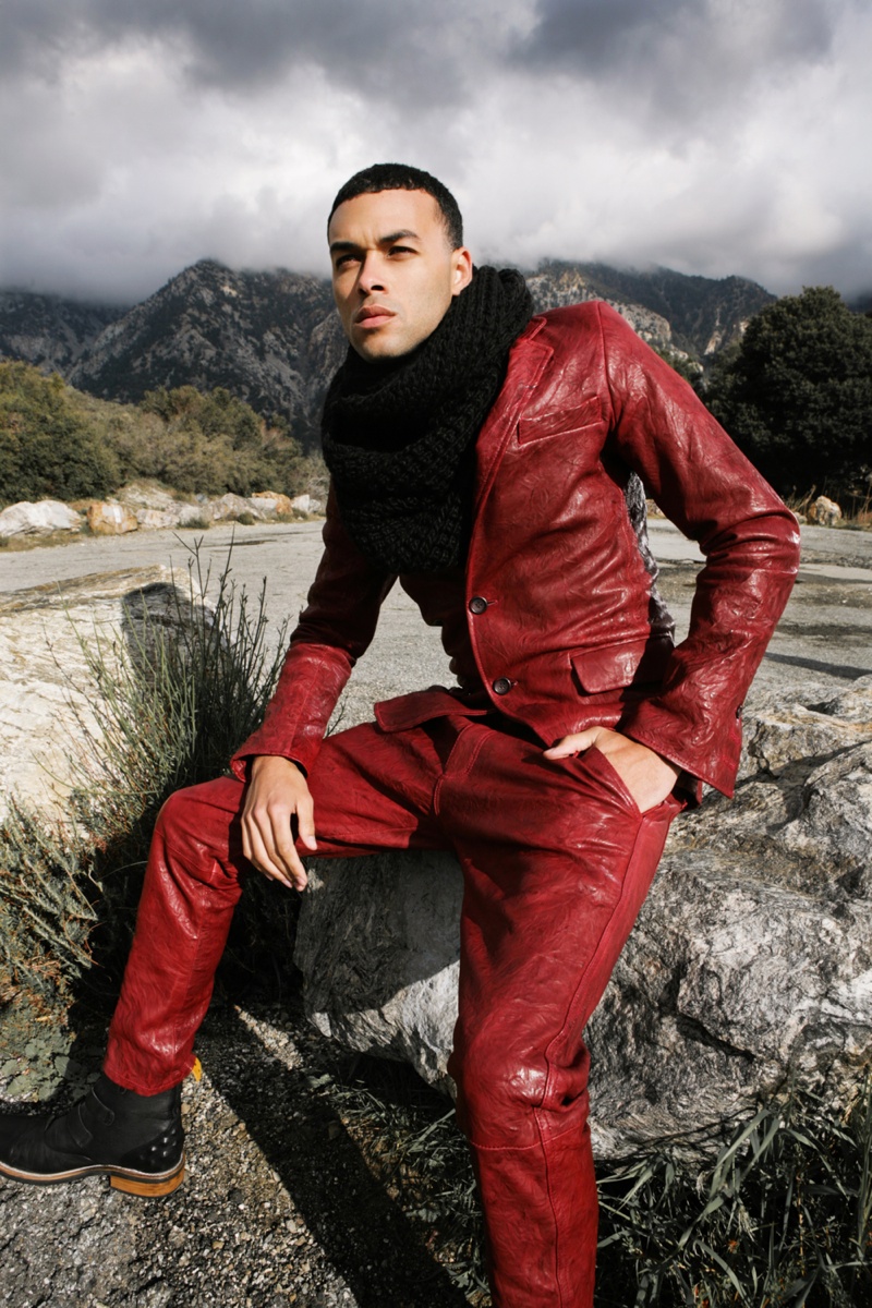 PinDon wears leather shirt and moto pants Wayward, blazer J.Cheikh, knit scarf Azul by Moussy and boots PS Kaufman.