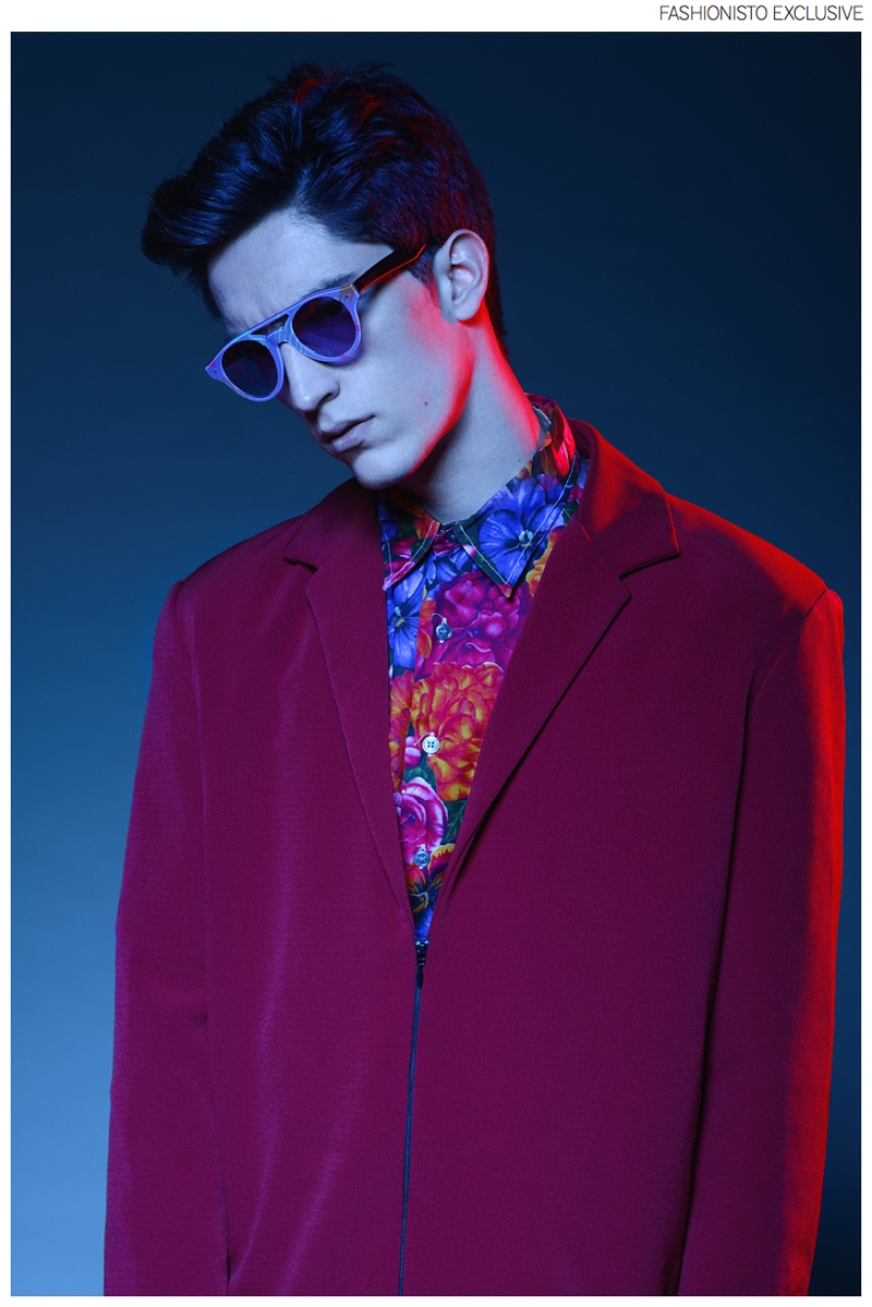 PinDustin wears bomber jacket, crop jacket and trousers Andrea Incontri, t-shirt Archivio Guerrini, vintage sunglasses A.N.G.E.L.O. and boots Dirk Bikkembergs.