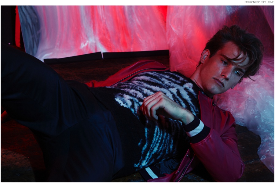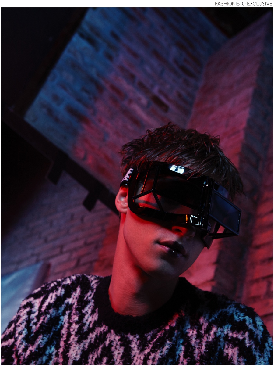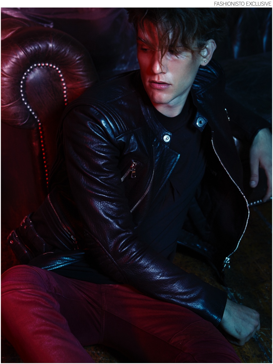 PinGianluca wears 3D molecule cashmere sweater CHRISTOPHER KANE and tartan wool gabardine jacket SAINT LAURENT BY HEDI SLIMANE.PinSebastian wears tiger mohair and wool blend sweater SAINT LAURENT BY HEDI SLIMANE, nappa leather bomber jacket LANVIN and wool flannel trousers GIORGIO ARMANI.PinAndreas wears zigzag motif wool blend sweater KRISVANASSCHE and black mask sunglasses LINDA FARROW X KTZ.PinSebastian wears sleeveless light cotton t-shirt DRKSHDW BY RICK OWENS, padded nappa leather biker jacket and geometric waxed denim biker jeans BALMAIN.PinLeft to Right: Gianluca wears wool jersey jogging trousers VIVIENNE WESTWOOD and nappa leather bermuda shorts GIVENCHY BY RICCARDO TISCI. Andreas wears faux leather and cotton jersey t-shirt NUMERO 00, nappa leather and will hat MARNI. Sebastian wears leather sleeves and herringbone wool coat by NEIL BARRETT.