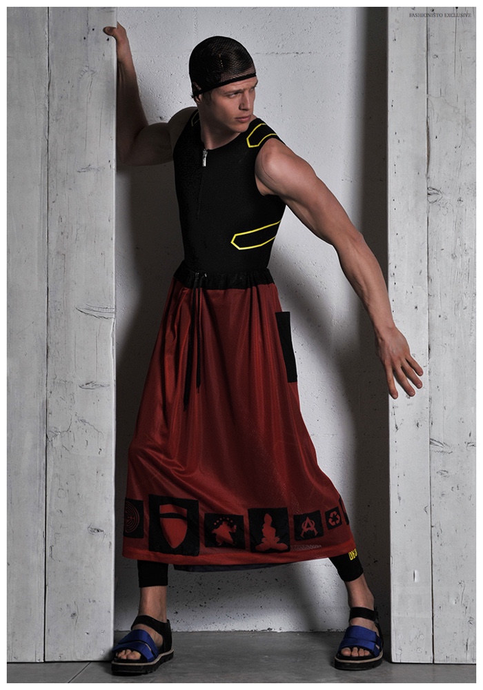 PinMarin is wearing trousers-skirt Angelos Frentzos, sandals D.GnakPinMarin is wearing cape D.Gnak, underwear Dirk Bikkembers, sandals O.X.S.PinMarin is wearing jumpsuit Dirk Bikkembergs, skirt Angelos Frentzos, sandals O.X.S.PinMarin is wearing sweatpants Black Believe, elastic belt (used as headband) Dirk Bikkembergs, sandals O.X.S.PinMarin is wearing belts and jockstrap Dirk Bikkembergs, sunglasses Mykita, sandals O.X.S.