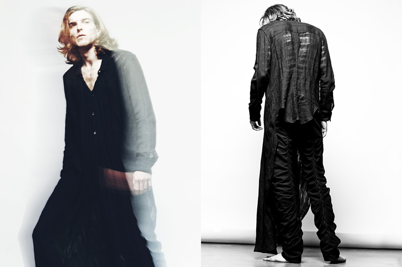 Left Paul wears silk shirt Damir Doma. Right Paul wears hooded sweatshirt Rick Owens.