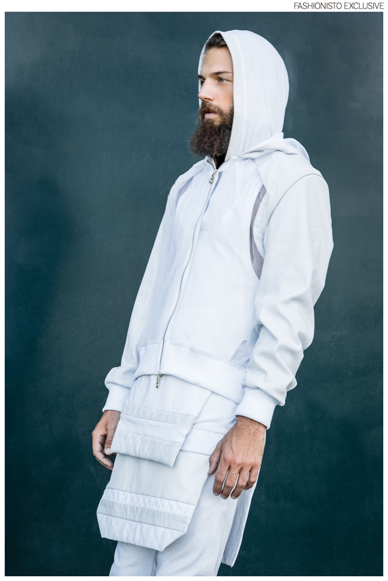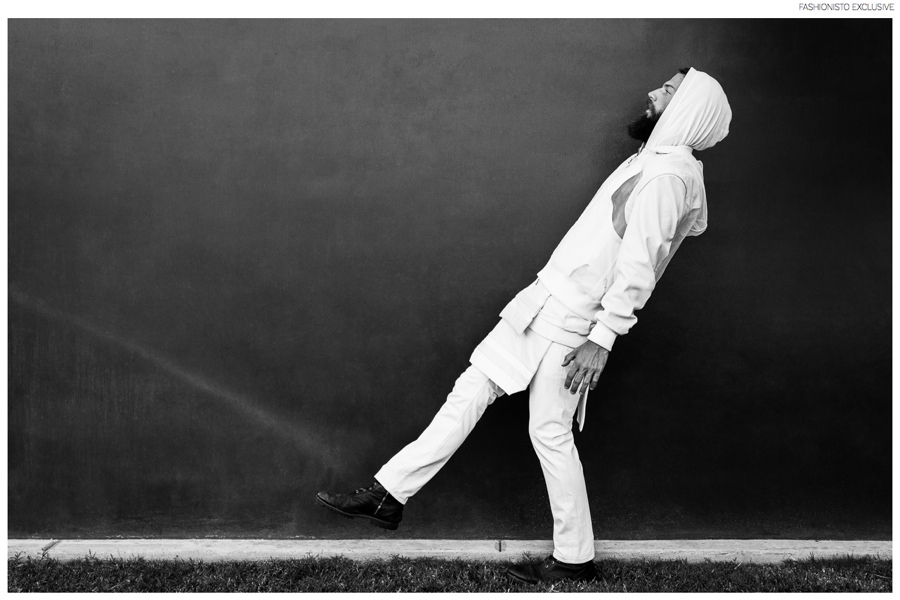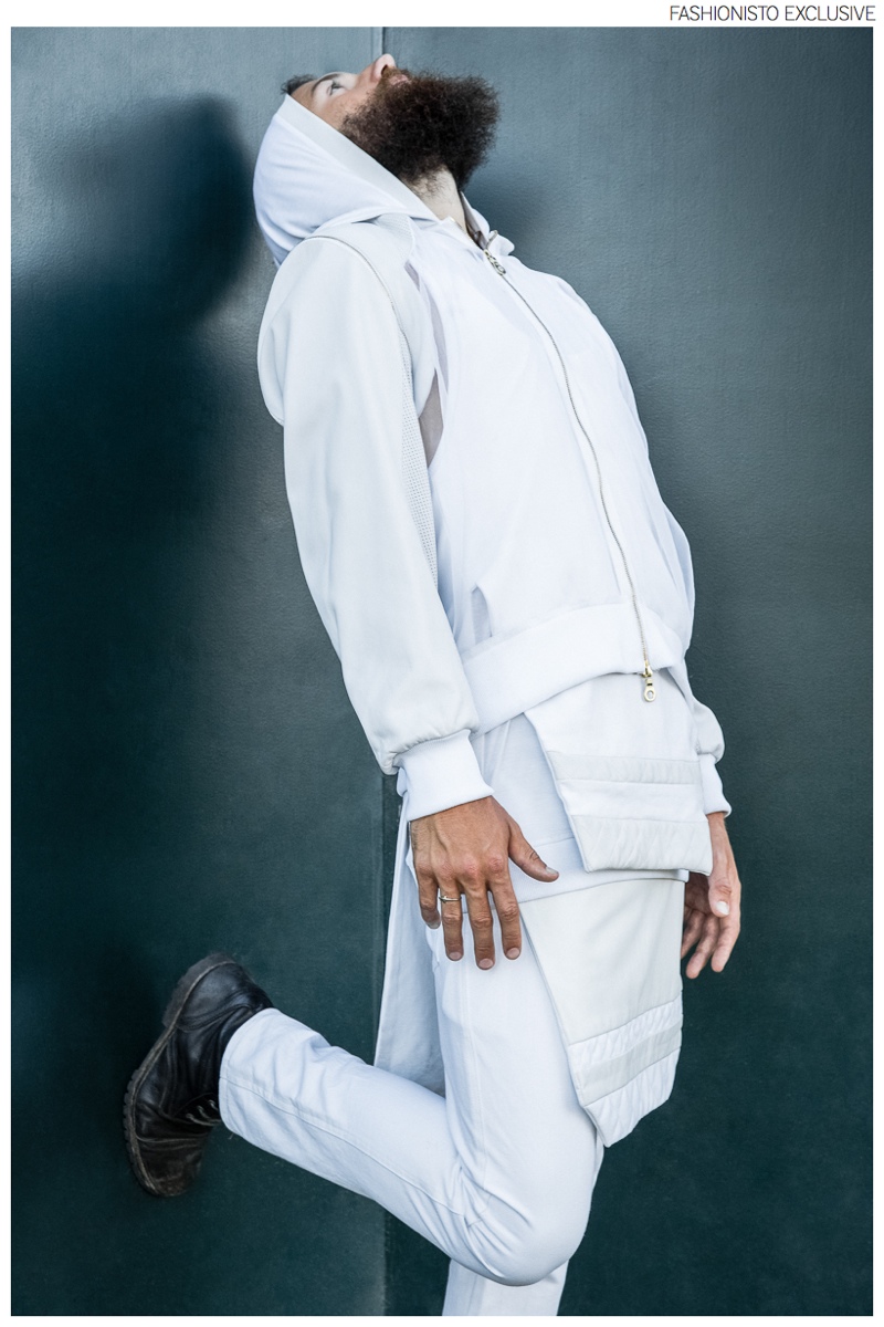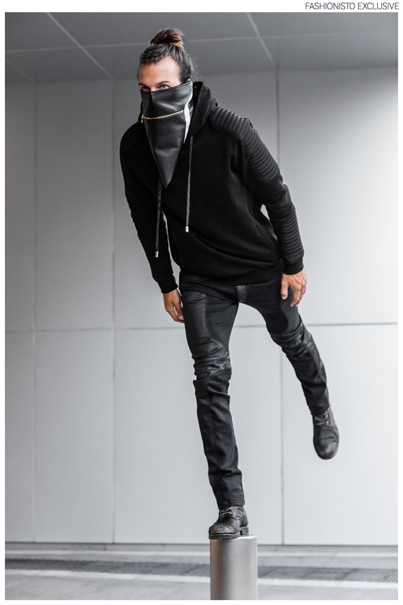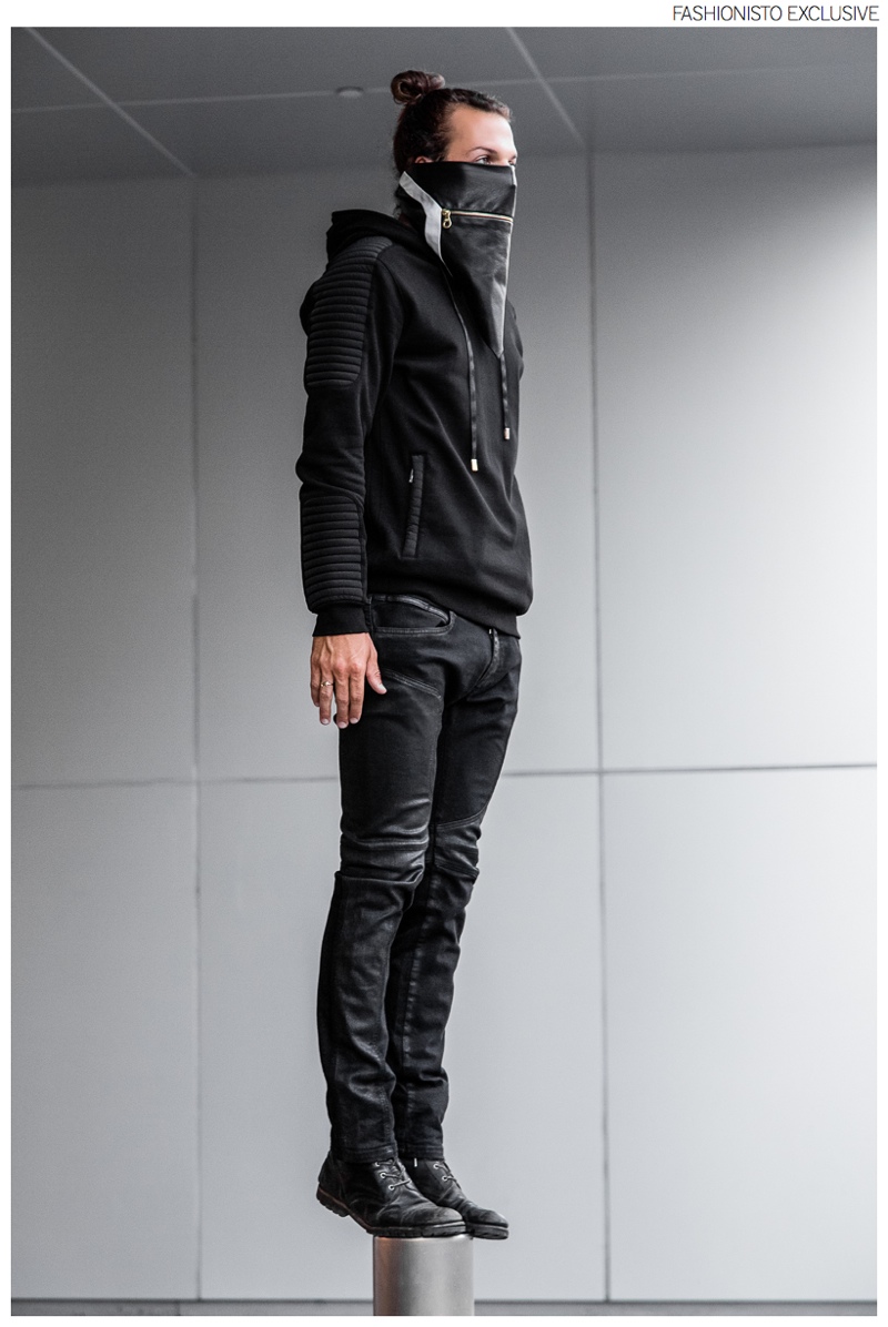 Get the Balance Right-Model Phil Sullivan (LA Models / New York Model Management) connects with photographer Ted Sun for a new exclusive featuring dramatic fashions from Ashton Michael and Les Benjamins. Pulled together by stylist Sherah Jones, streetwear influences come together with a modern attitude for monochromatic looks. / Grooming by Natasha H.