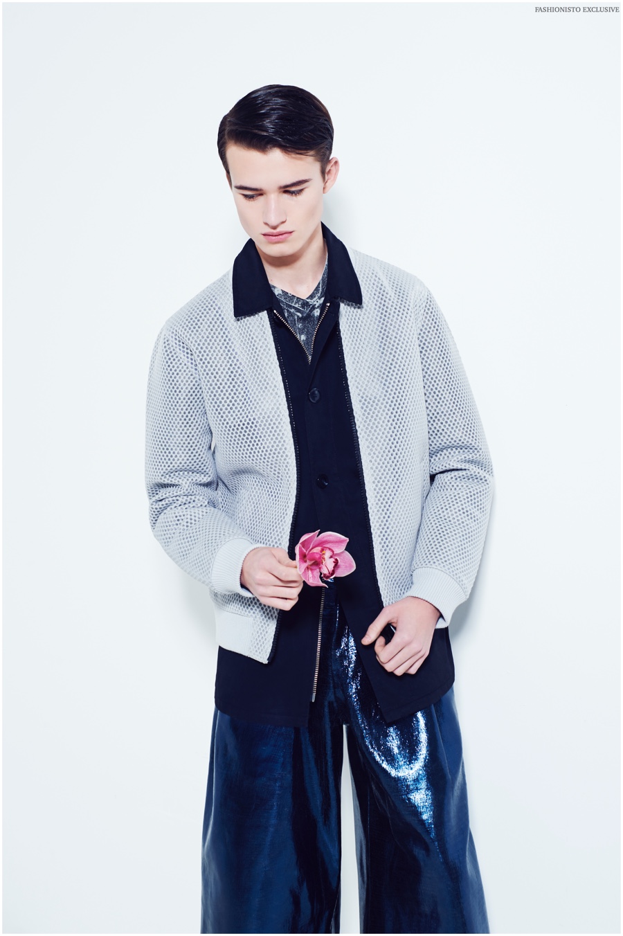 Reece wears sunglasses Black Eyewear, tee and turtleneck Topman, trousers and quilted jacket Hardware.Pin
