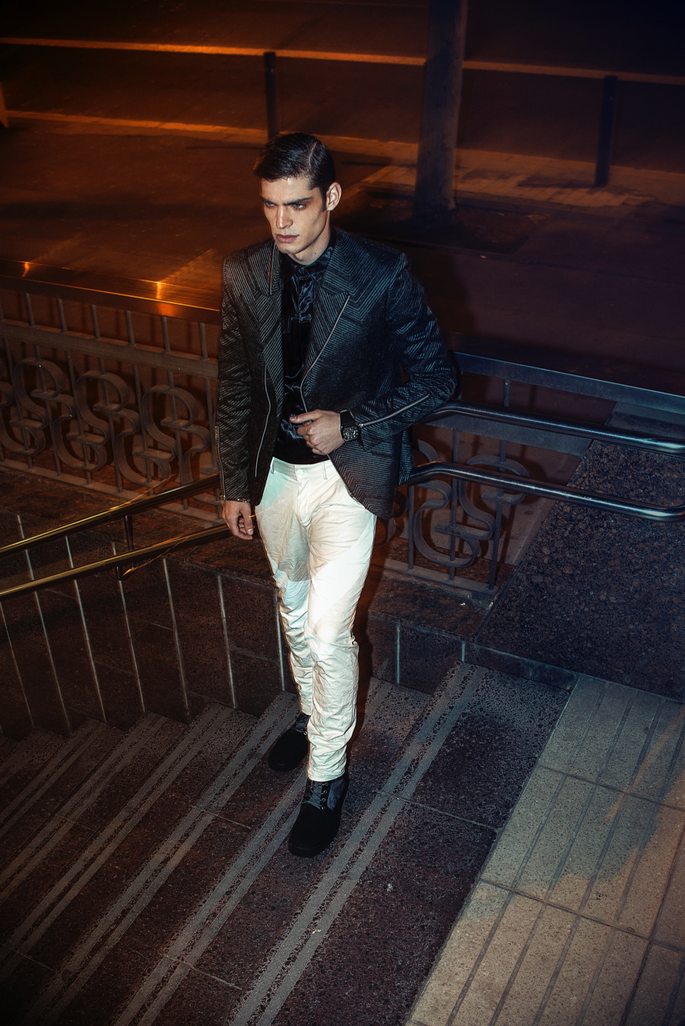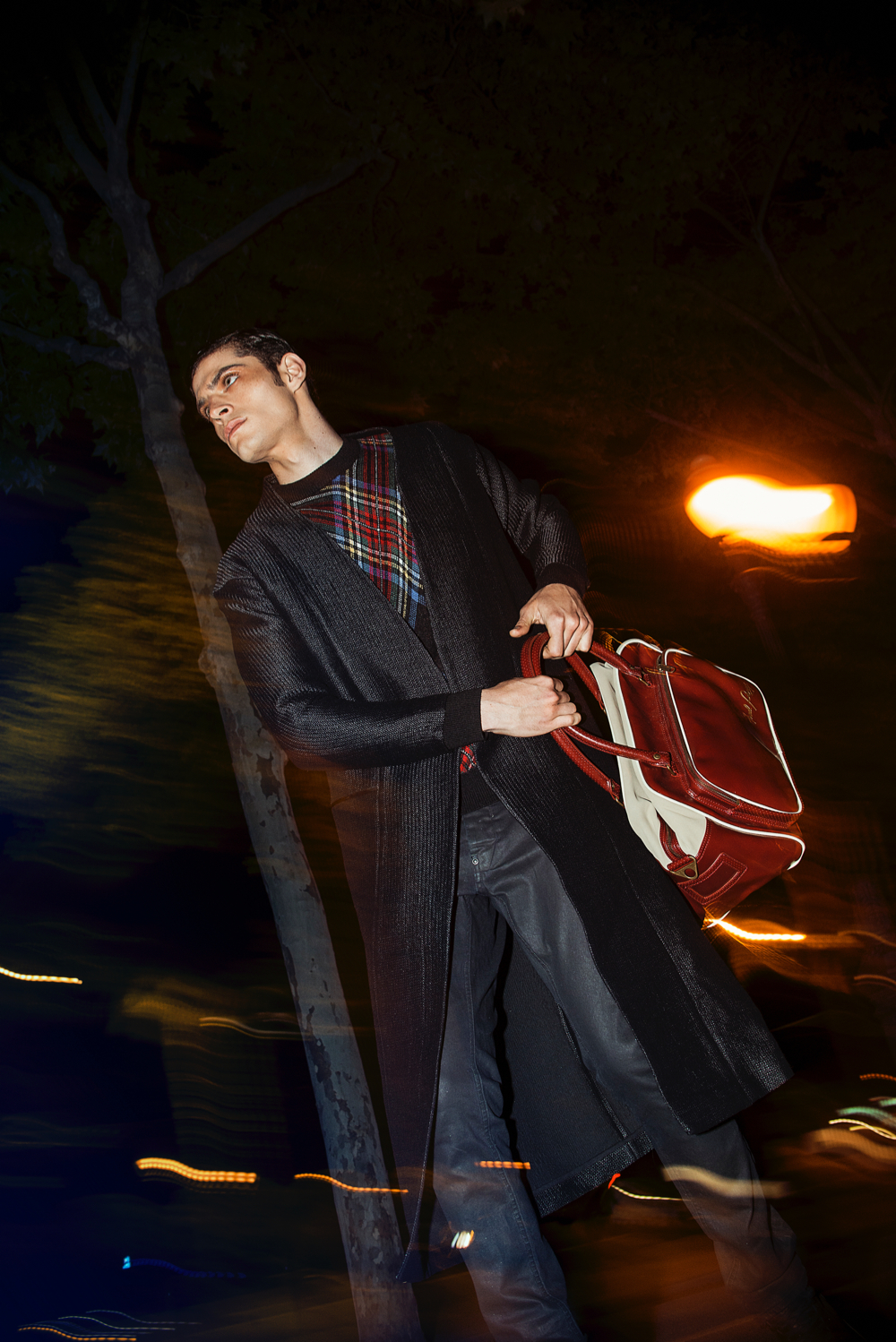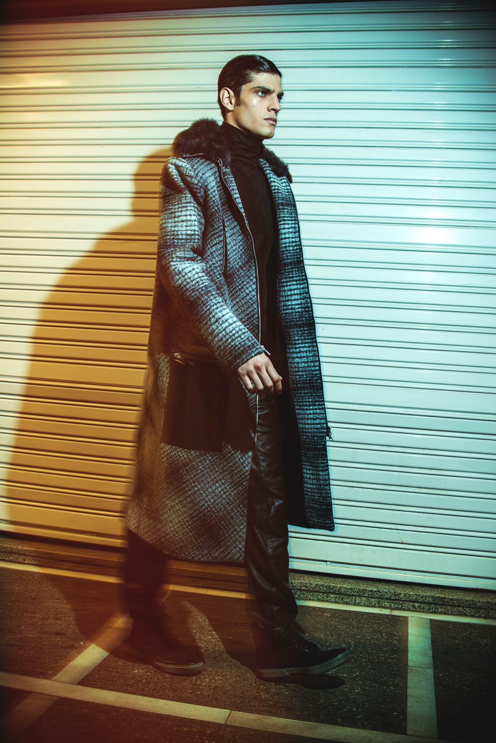 City Lights–Following an exclusive last year, Blow model Stefano returns for a new story lensed by photographer Rubén Suárez. Looking forward to fall, Stefano finds himself outside, styled in cold-weather fashions pulled together by stylist Rocio Valiño. From a metallic bomber and long coat to treated pants, Stefano is easily a modern vision. / Photo assistance by Xevi Abril. Makeup by Dani Moon.