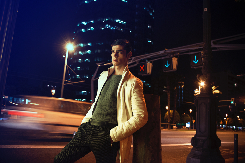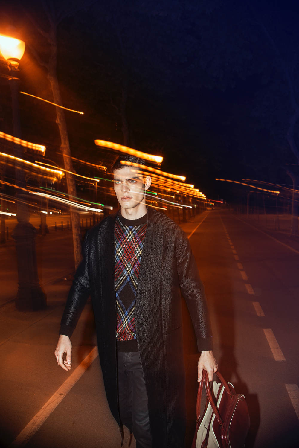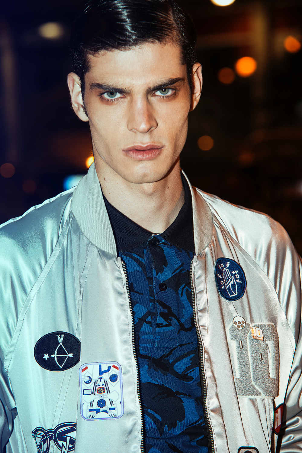 City Lights–Following an exclusive last year, Blow model Stefano returns for a new story lensed by photographer Rubén Suárez. Looking forward to fall, Stefano finds himself outside, styled in cold-weather fashions pulled together by stylist Rocio Valiño. From a metallic bomber and long coat to treated pants, Stefano is easily a modern vision. / Photo assistance by Xevi Abril. Makeup by Dani Moon.