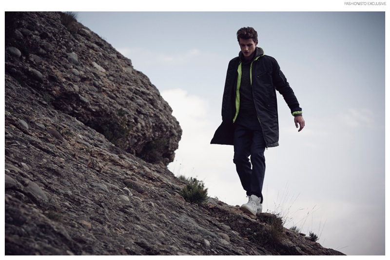 Tino wears gray jacket Levi’s, long black coat Martin Lamothe, multi-colored windbreaker Rebok, gray jumper Fred Perry, trousers Dior Homme and sneakers H&M.