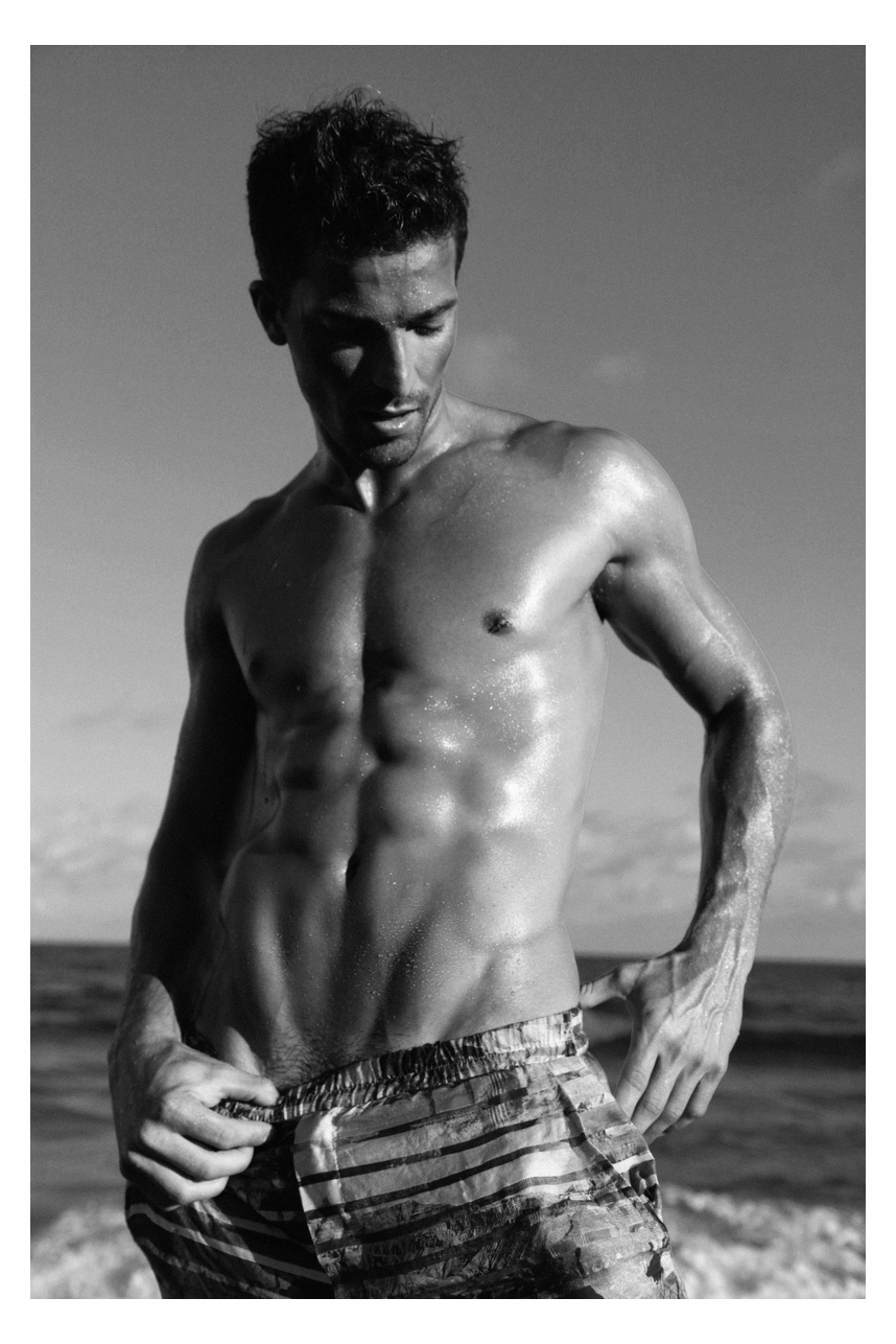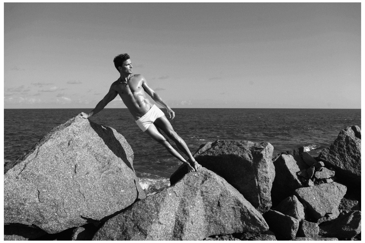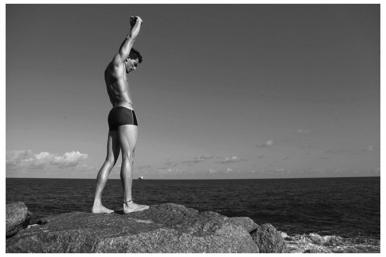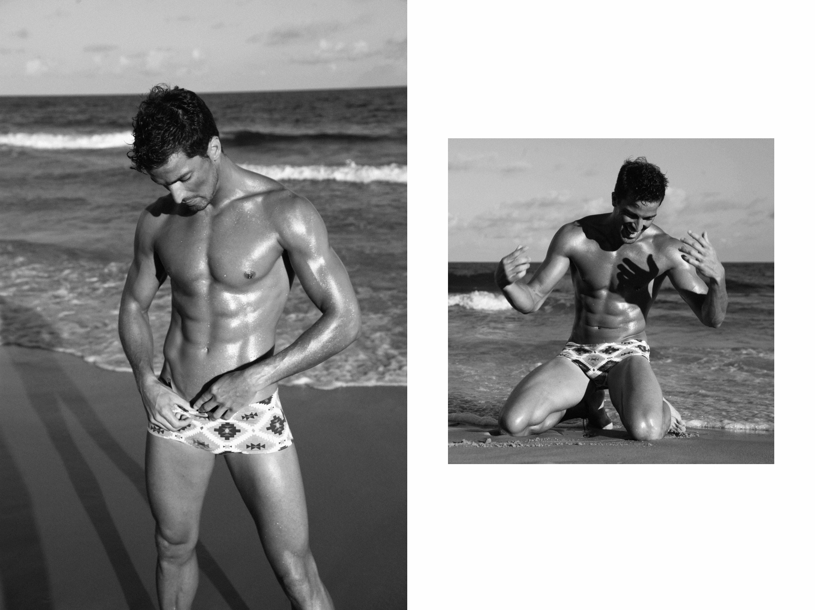 Summer Days–Model Felipe Mattos (Amazing) is ready for summer with the perfect beach body for photographer Ronald Luv. Clad in a varied line of swim trunks pulled together by stylist Ana Parisi, Felipe sizzles and stuns before the vast, eternal ocean. / Grooming by Teo Miranda.