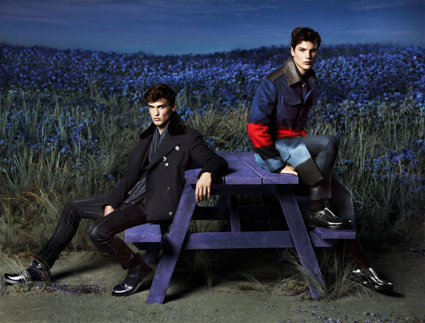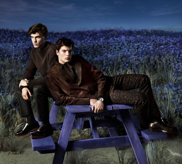 Salvatore Ferragamo Fall/Winter 2014 Campaign-For the first time, Salvatore Ferragamo looks to multiple models to front its advertising campaign. Photographed by Mert & Marcus, models Felix Hermans and Jason Anthony come together in a field of lavender. Posing for dramatic images, the pair model choice looks from the fall/winter 2014 menswear collection of creative director Massimiliano Giornetti.