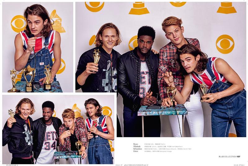 PinModels Roberto Sipos, Ryan Keating, Sebastian Sauve, Minkah Davidson and Peter Raven Maben star in a boy band inspired fashion editorial for FHM Collections China.