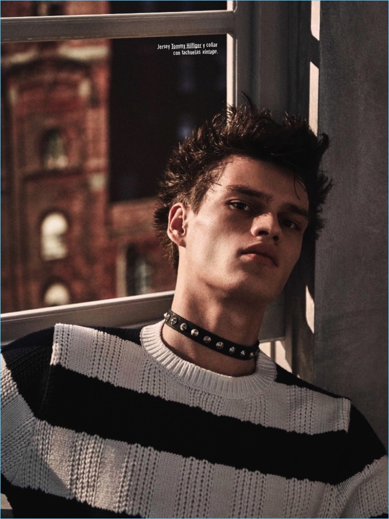 PinChanneling a punk edge, Filip Hrivnak rocks a striped Tommy Hilfiger sweater.