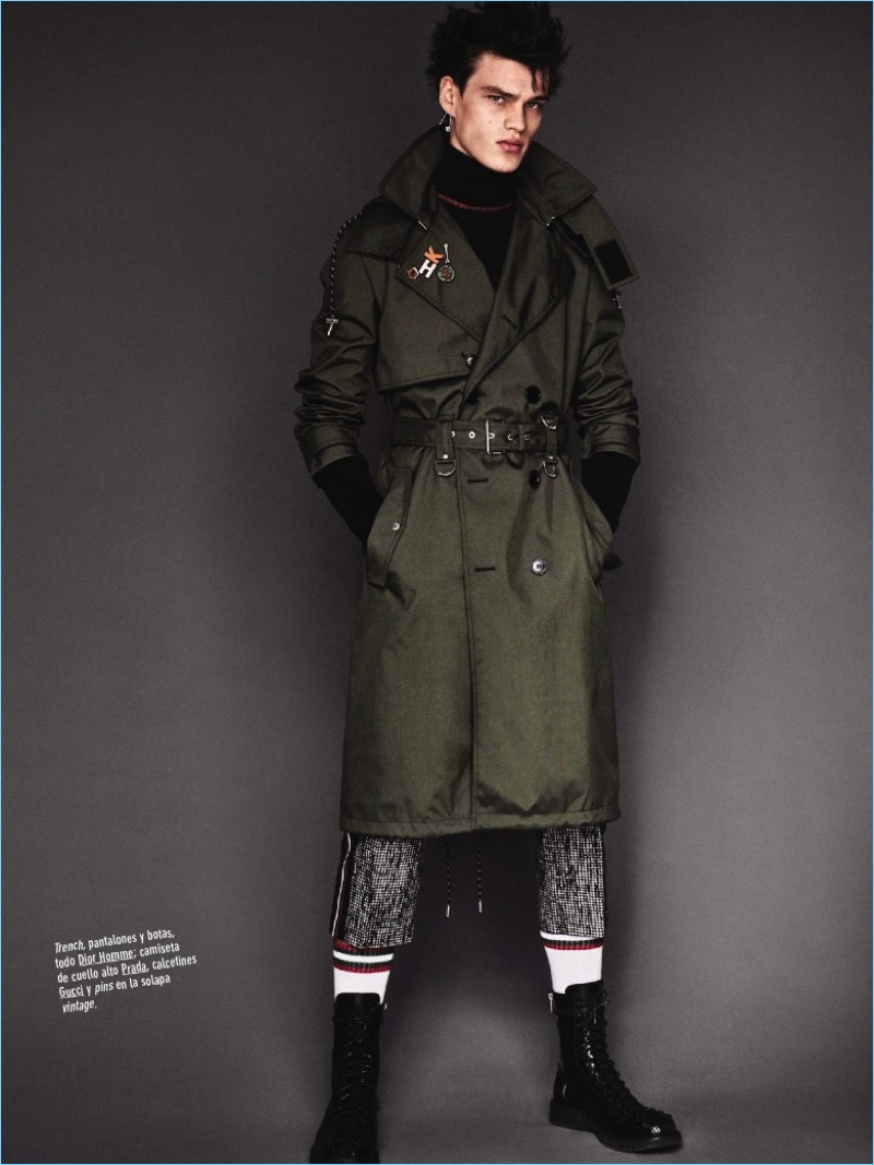 PinStarring in a GQ España editorial, Filip Hrivnak rocks a trench, cropped trousers, and boots by Dior Homme. Filip also wears a Prada turtleneck and Gucci socks.