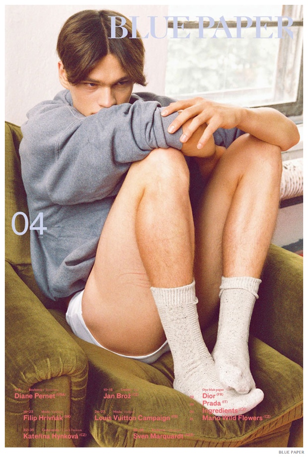 Underwear Day-Reuniting with photographer Branislav Simoncik after appearing in a Givenchy editorial for Top Fashion magazine, model Filip Hrivnak stars in the cover story for the fourth issue of Blue Paper. Posing amongst a minimal location in underwear and activewear, Filip offers a relaxed attitude for a series of laid-back images.