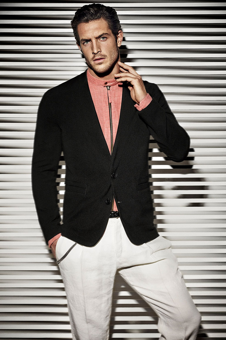 Armani Collezioni Spring/Summer 2014 Campaign–Wearing a deconstructed black jacket, crisp ice white trousers and a collarless coral linen shirt, model Justice Joslin appears in the first advertising image released by Italian label Giorgio Armani to promote their Armani Collezioni line. Perfectly embodying the concept of modern masculine elegance, Justice is the leading man this season looking flawless as usual in this striking image.