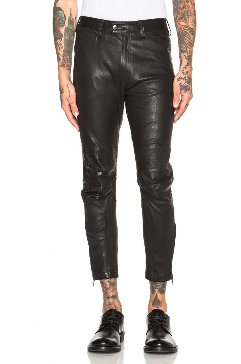 PinLeft to Right: Diego wears field jacket, twisted tulle tank, cropped trousers and sock sneakers Rick Owens. Diego wears elongated print tee, leather trousers, dress shoes and backpack Ann Demeuelemeester.