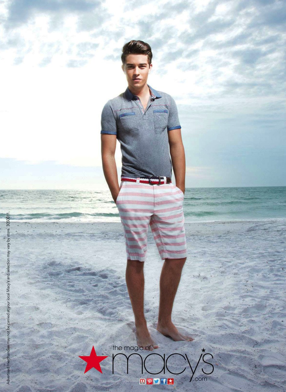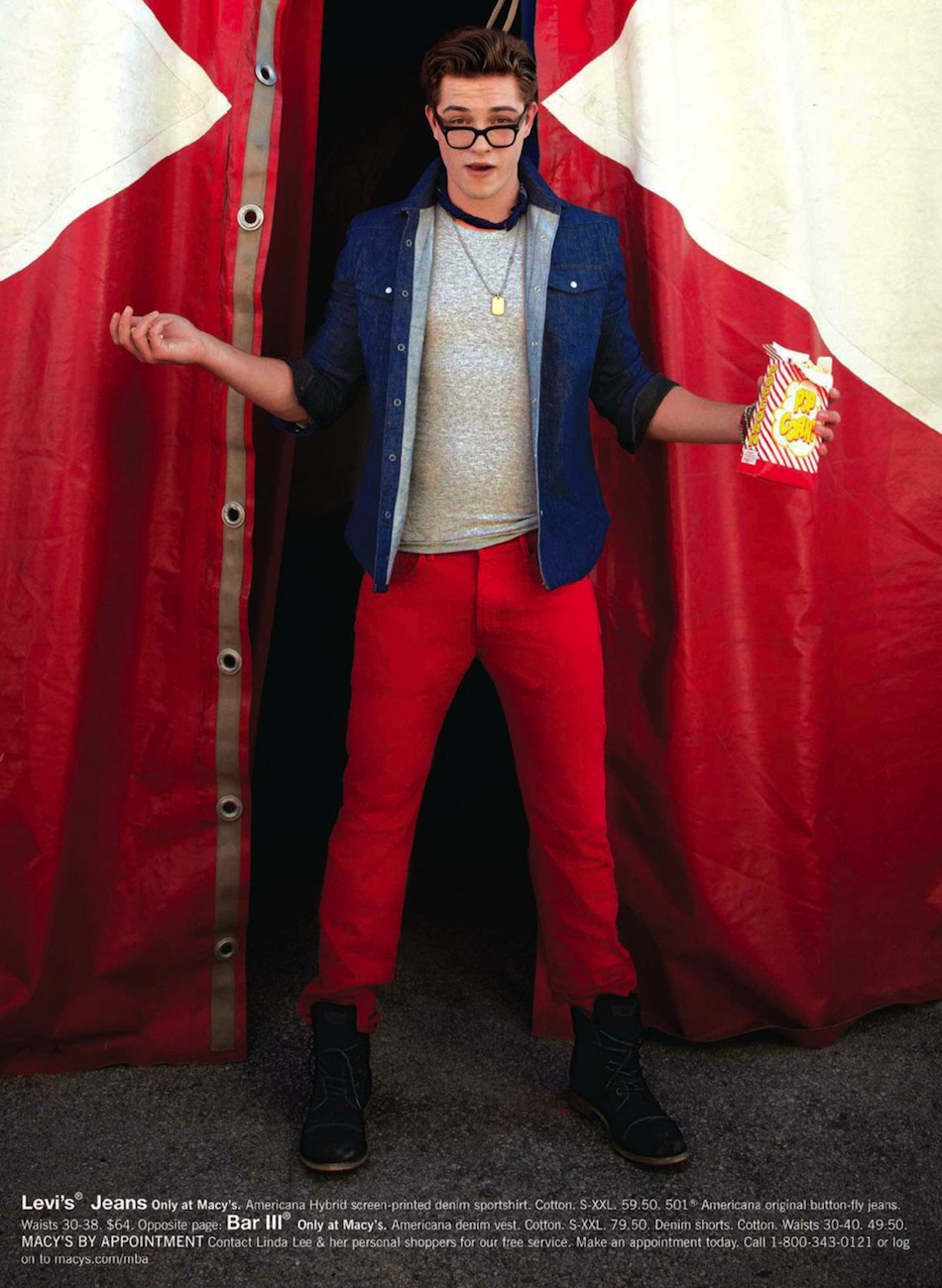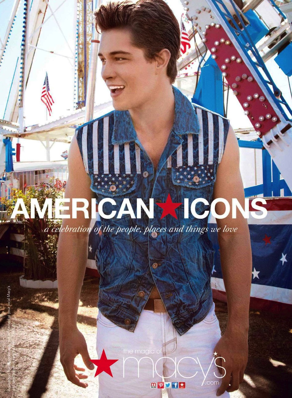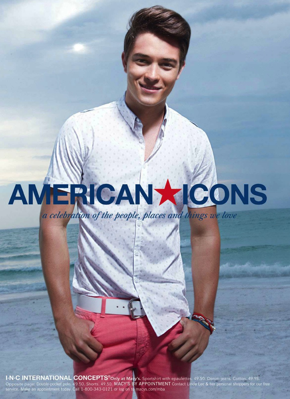 American Boy–For summer 2013, Macy’s celebrates iconic American style with an exclusive selection of brands and garments available to purchase at its department stores. To unveil us its patriotic mood, Macy’s enlists model Francisco Lachowski, who delivers his infectious smiles in the newly released advertisements. Clad in timeless denim pieces or in 1950’s inspired styles, Francisco pays tribute to America’s iconic global sense of style with his playful charisma, posing seaside or in a colorful fun fair.