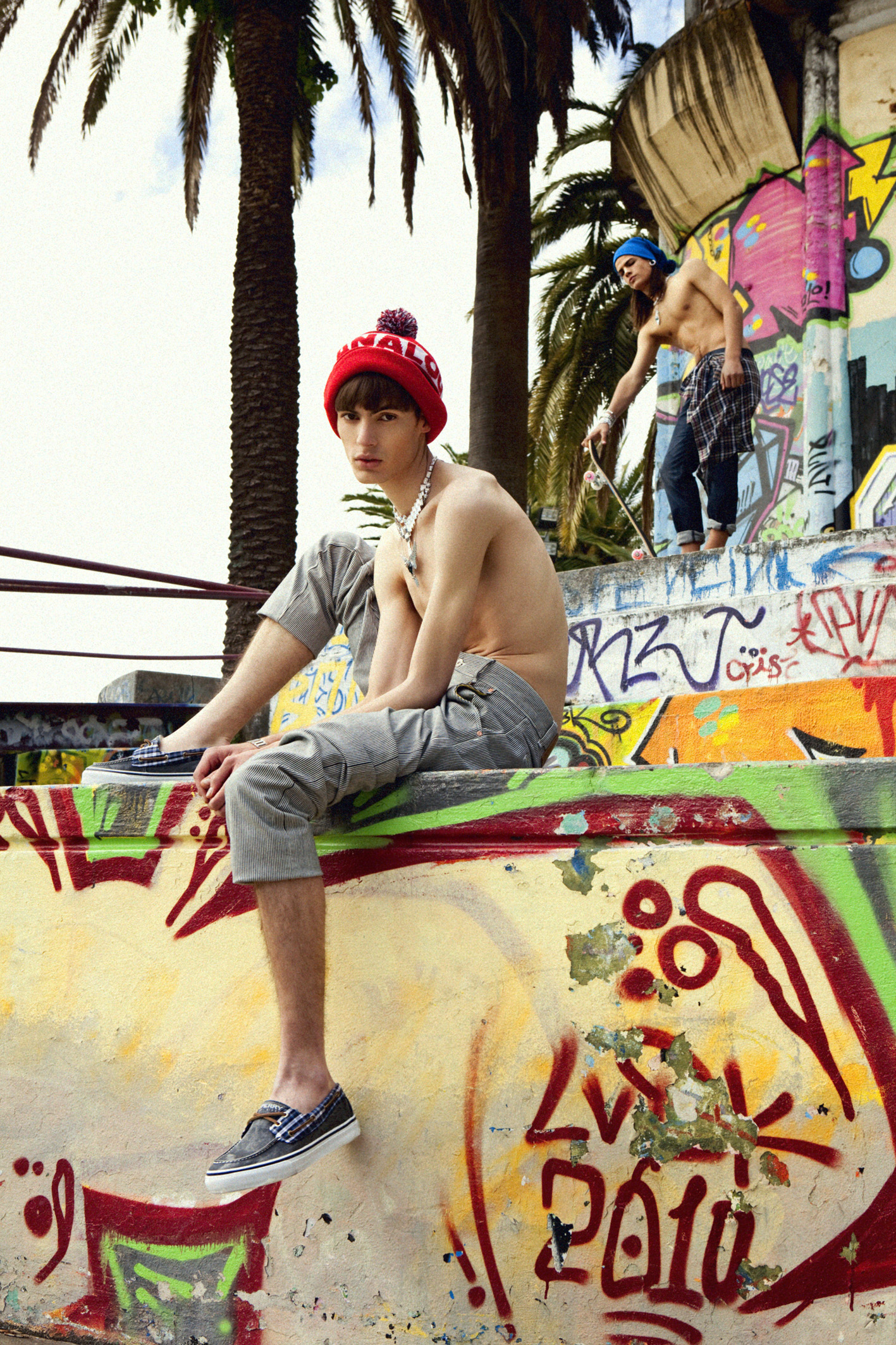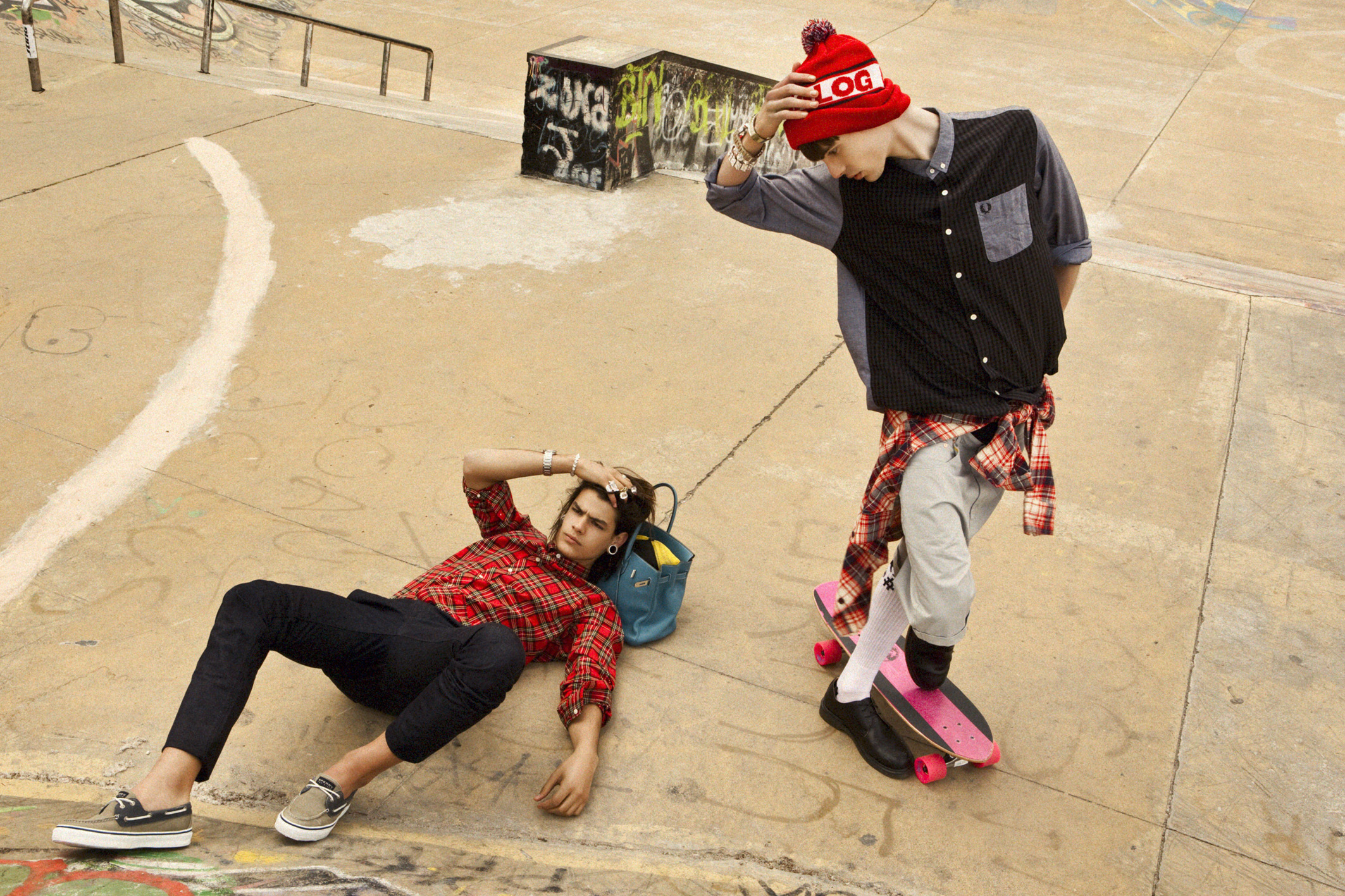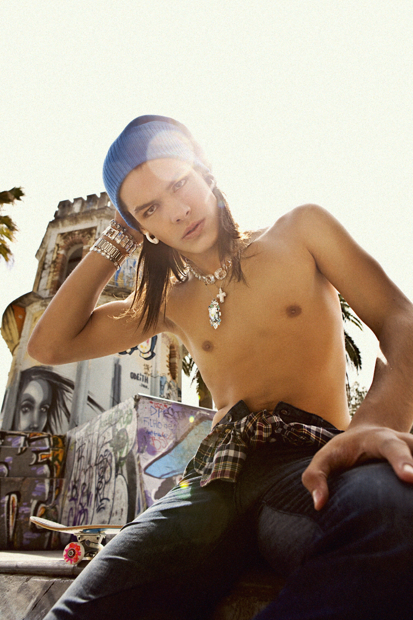Lords of Dogtown–Embracing a west coast attitude, Elite Lisbon models Francisco Soares and Vick star in Daily Bless magazine’s latest editorial, “Skater Rules,” directed by photographer Ana Luisa Silva. Pairing Swarovski jewelry with street labels such as Wesc, Sperry, and Doc Martens, stylist Tiago Ferreira redefines casual cool with the skater boys. / Grooming by Andre Neto Oliveira.