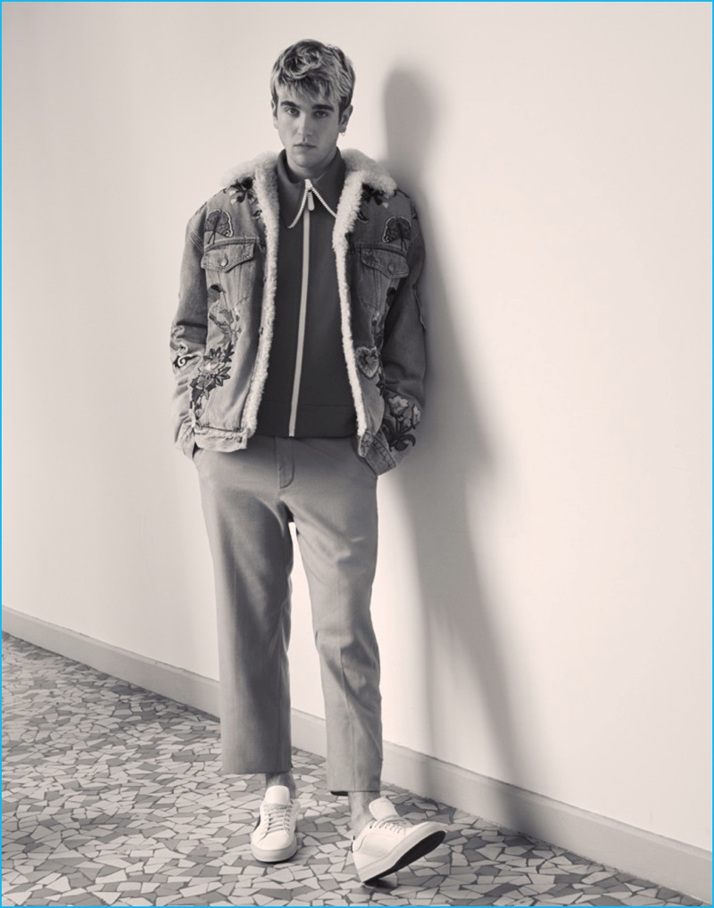Embracing a nonchalant attitude, Gabriel-Kane Day-Lewis wears a Gucci denim jacket and pants with a Burberry track jacket, and Paul Smith sneakers.Pin