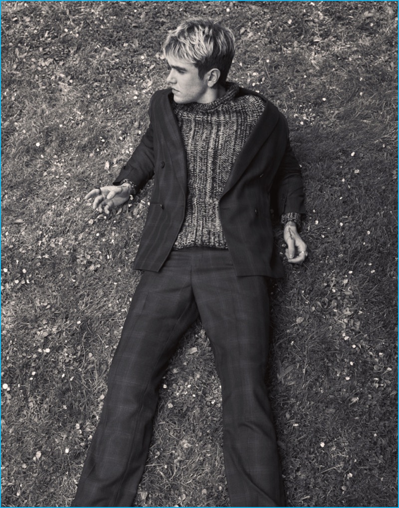 Rahel Weiss photographs Gabriel-Kane Day-Lewis in a check Paul Smith suit with an Acne Studios marled knit sweater.Pin