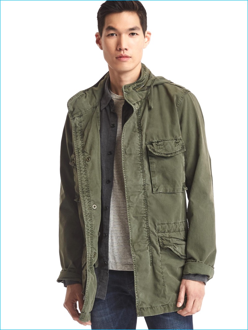 Gap embraces the military trend with its army green hooded fatigue jacket.