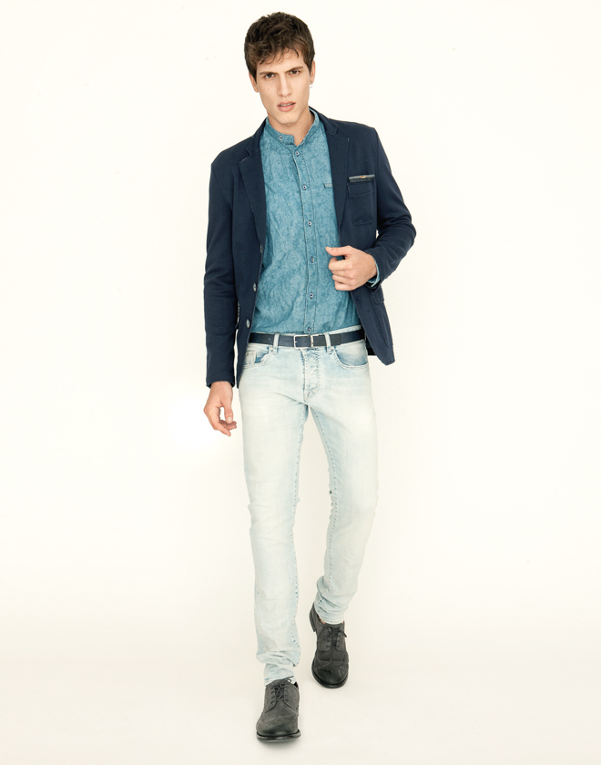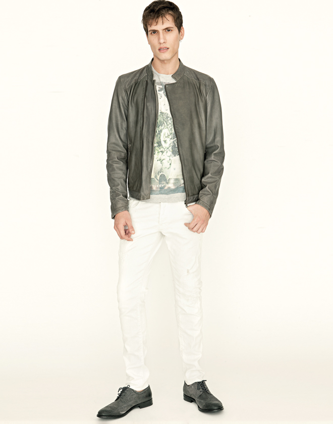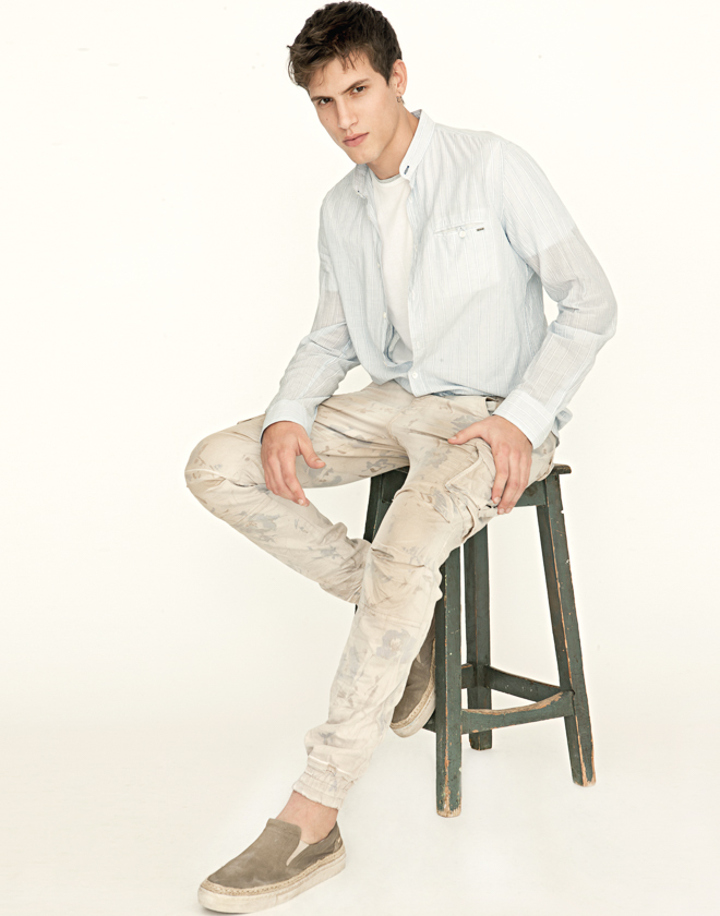 Italian denim brand Gas Jeans enlists model Adrian Cardoso for a studio shoot featuring a spring preview. Embracing timeless denim looks with a clean, sophisticated style, Adrian is front and center. Distressed denim is unsurprisingly the hero of the outing with distressed varieties incorporated into jackets, jeans and smart shirts.