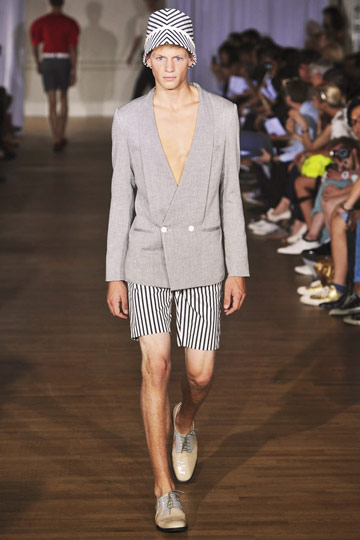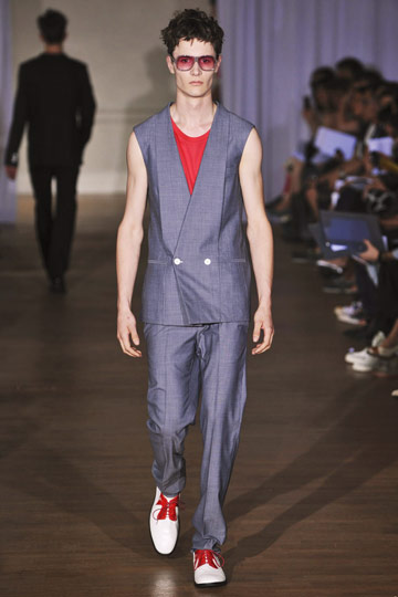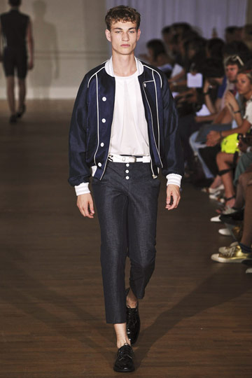 Inspired by the Americana motif and America’s west coast, designer Gaspard Yurkievich’s most recent collection uses blue, red and white to play to our senses of leisure and merriment. V-neck blazers give the appearance of boxy lapels, while sculpted shoulders reference the all-American jock. Stripes and button down flies continue the collection’s youthful zest, while slim fitting above the ankle trousers lends the selection a preppy quality. Altogether, Yurkievich’s efforts do not go unnoticed, resulting in another quirky, but wearable collection from the Parisian designer.