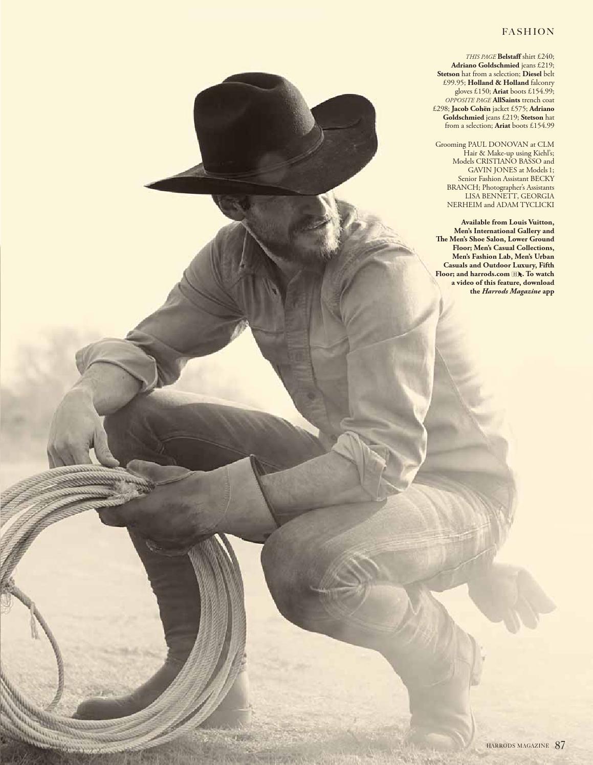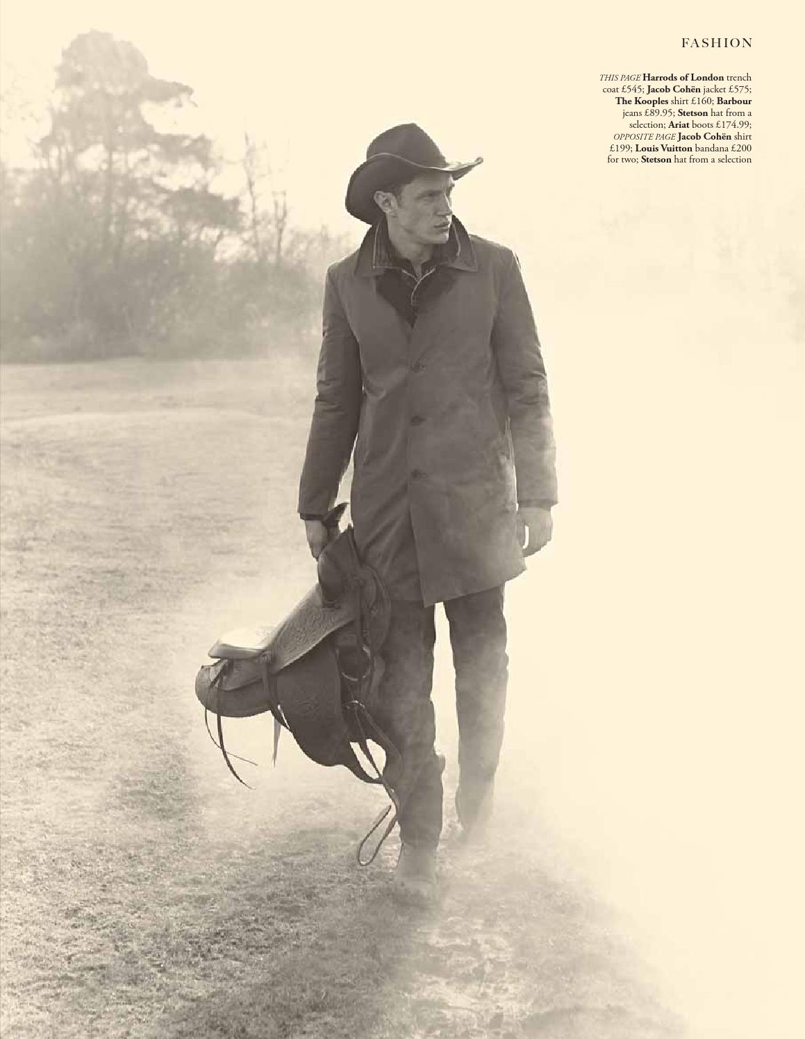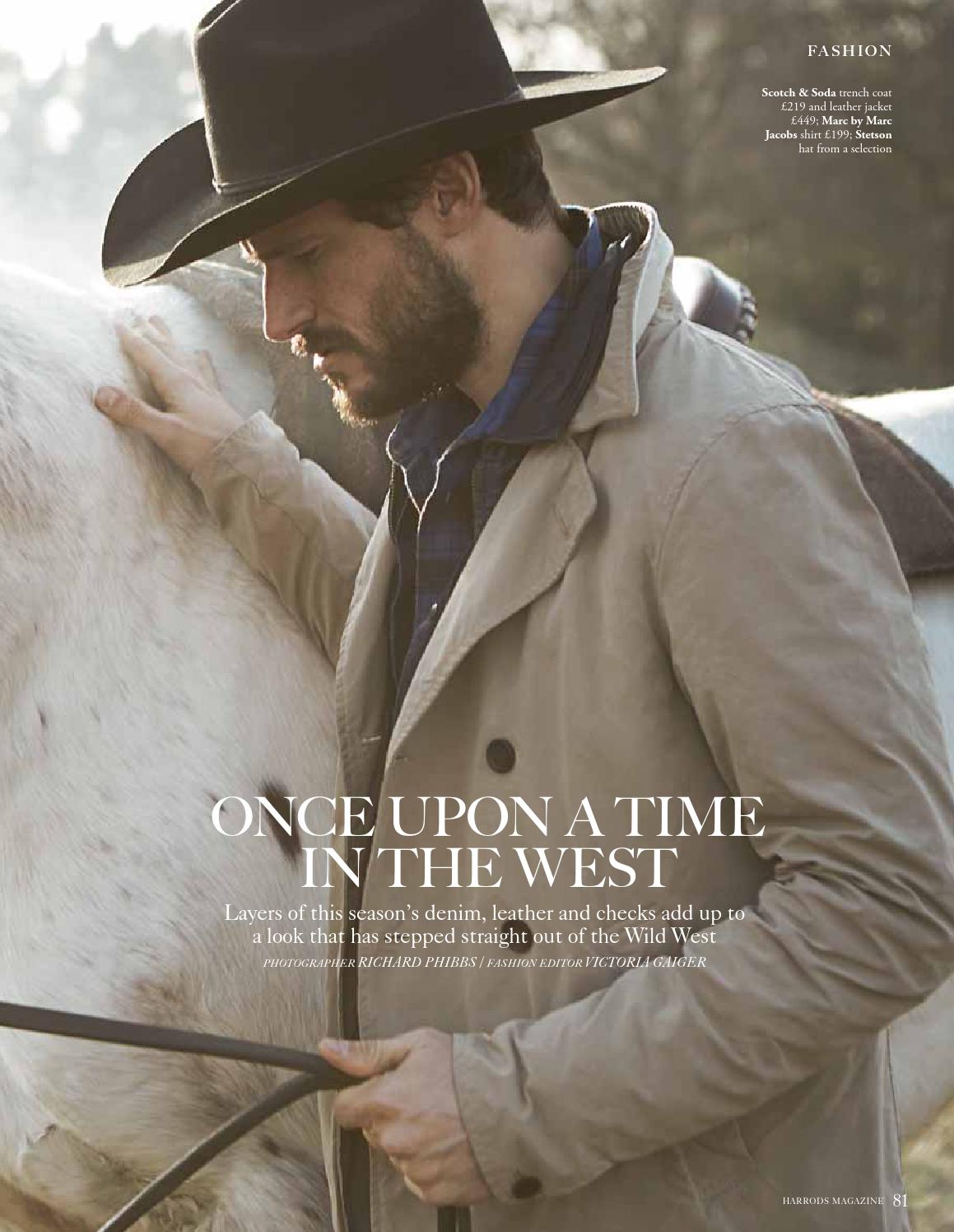 Once Upon a Time in the West–Jumping on the cowboy bandwagon, Harrods enlists photographer Richard Phibbs for a story in its June/July magazine issue. Connecting with stylist Victoria Gaiger, Phibbs shoots models Gavin Jones and Cristiano Basso. Portraying cowboys, the pair wear slim-cut denim jeans, long trench coats, relaxed shirting, neckerchiefs and sturdy boots.