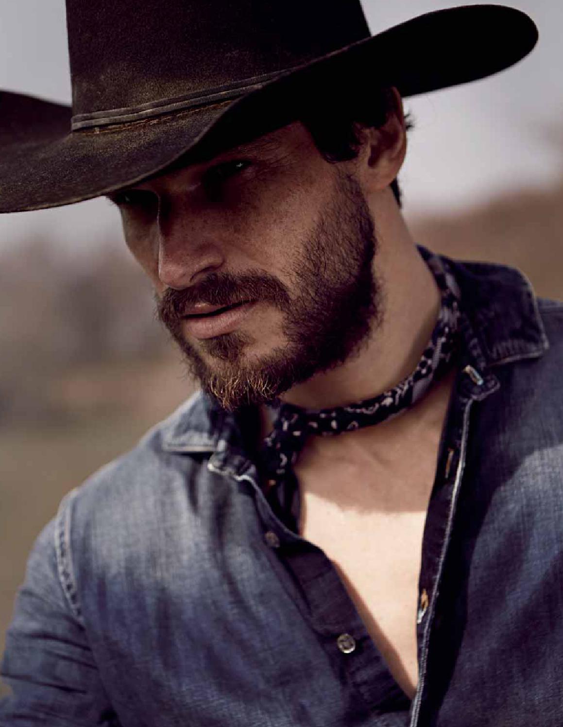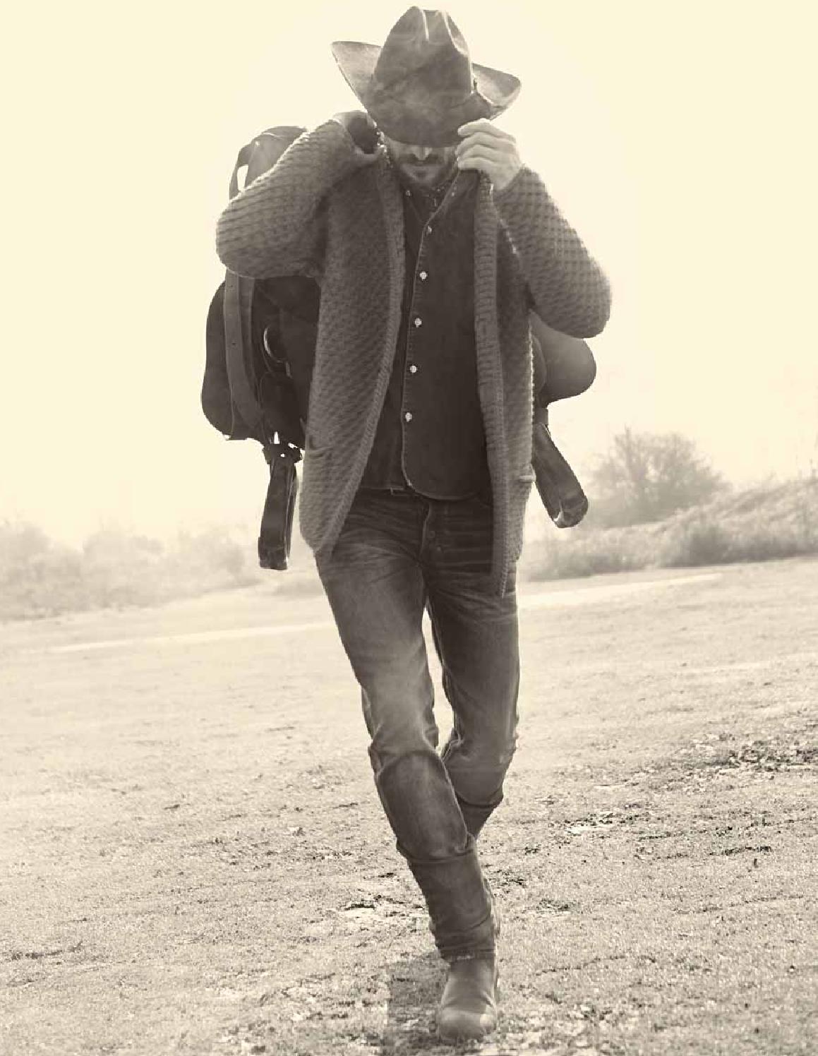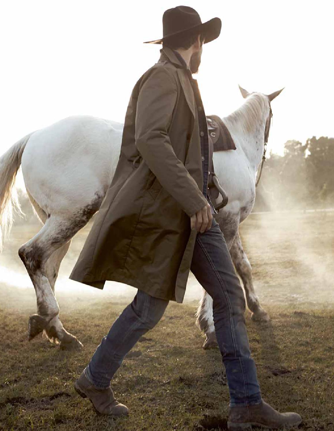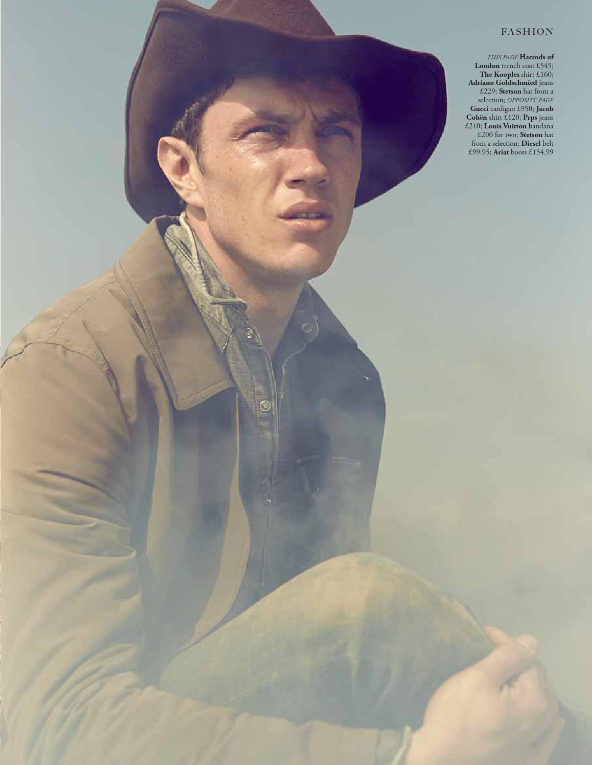 Once Upon a Time in the West–Jumping on the cowboy bandwagon, Harrods enlists photographer Richard Phibbs for a story in its June/July magazine issue. Connecting with stylist Victoria Gaiger, Phibbs shoots models Gavin Jones and Cristiano Basso. Portraying cowboys, the pair wear slim-cut denim jeans, long trench coats, relaxed shirting, neckerchiefs and sturdy boots.