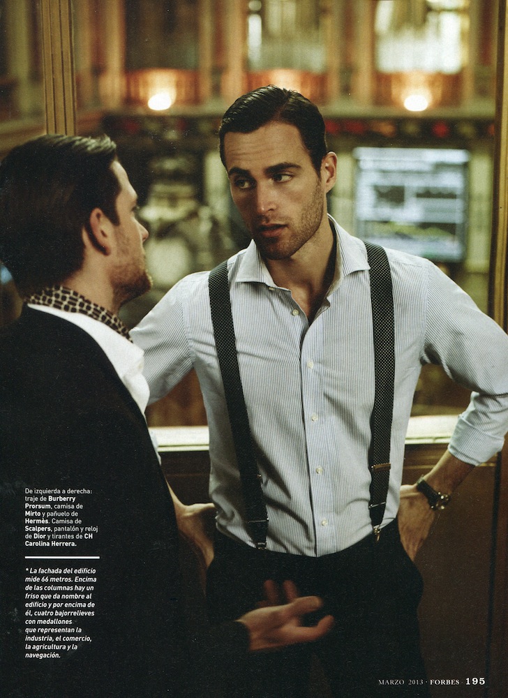 A Polished Business–For the first issue of Spanish Forbes, photographer Rafa Gallar captures Sight models George Paul and Christian Santamaria in a story staged at Madrid Stock Market. Dressed to impress for a long working day, the pair don formal styles that come straight from the most prestigious menswear collections, including Loewe, Tommy Hilfiger and Massimo Dutti.